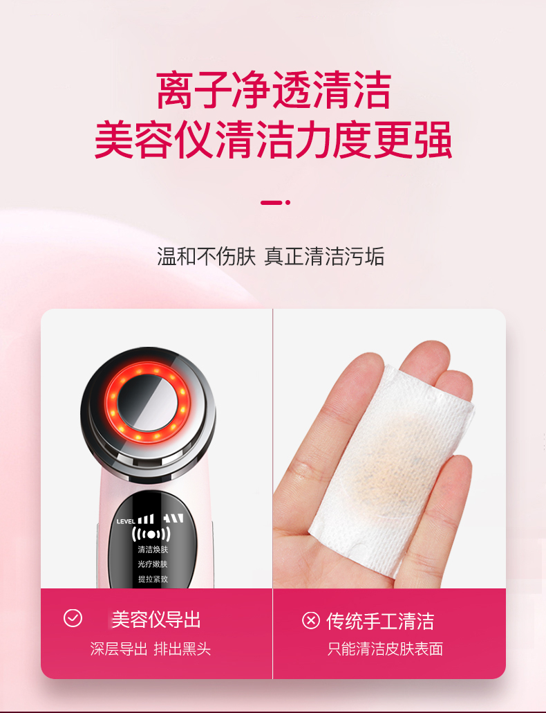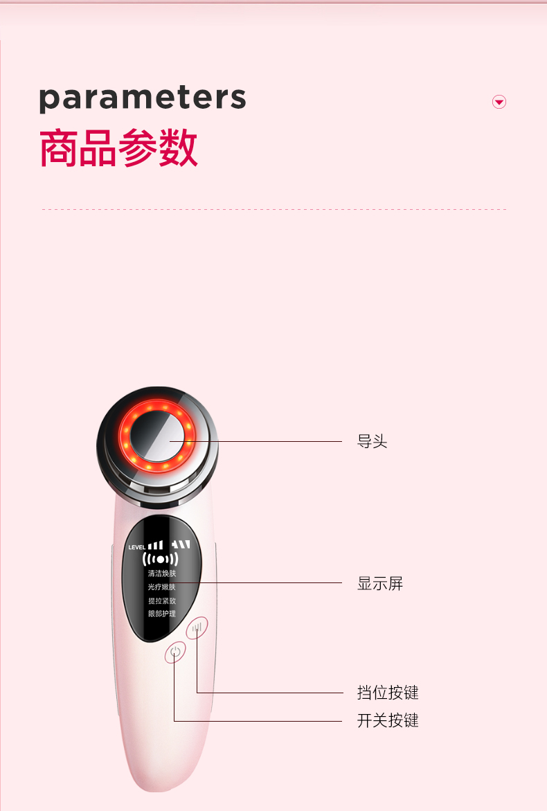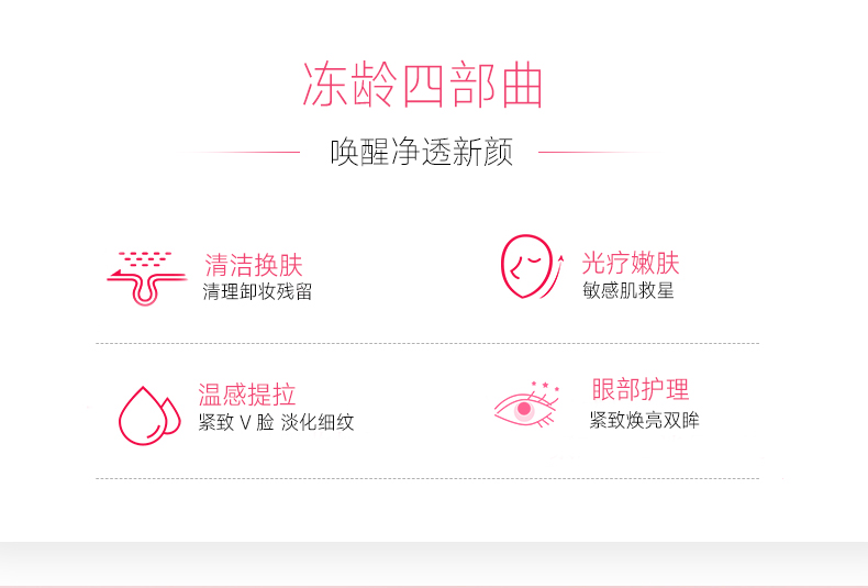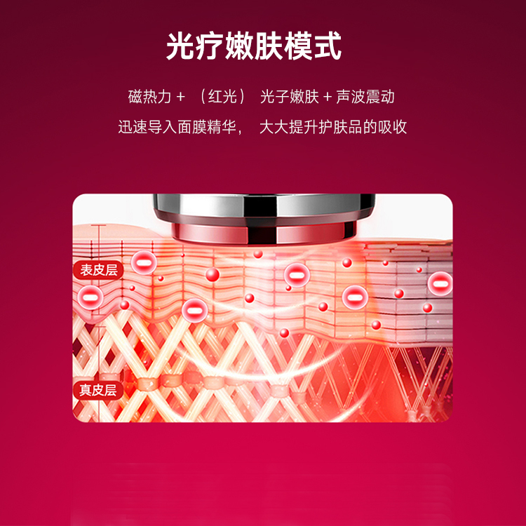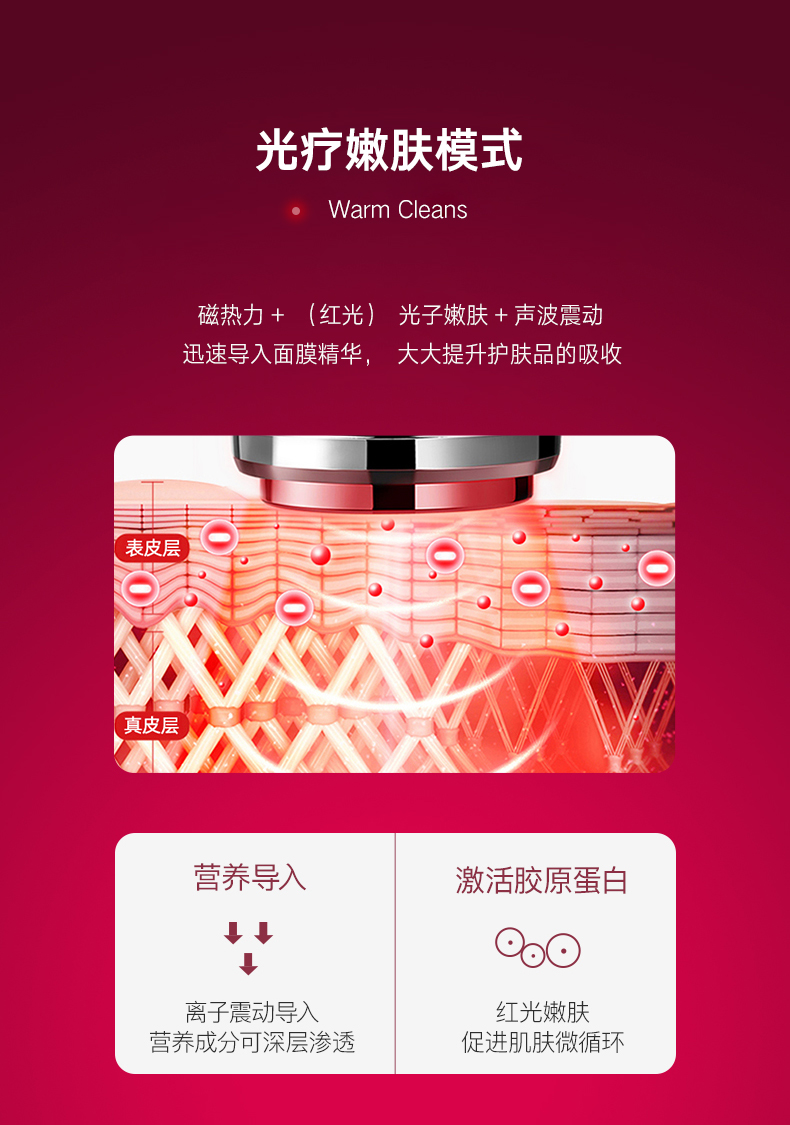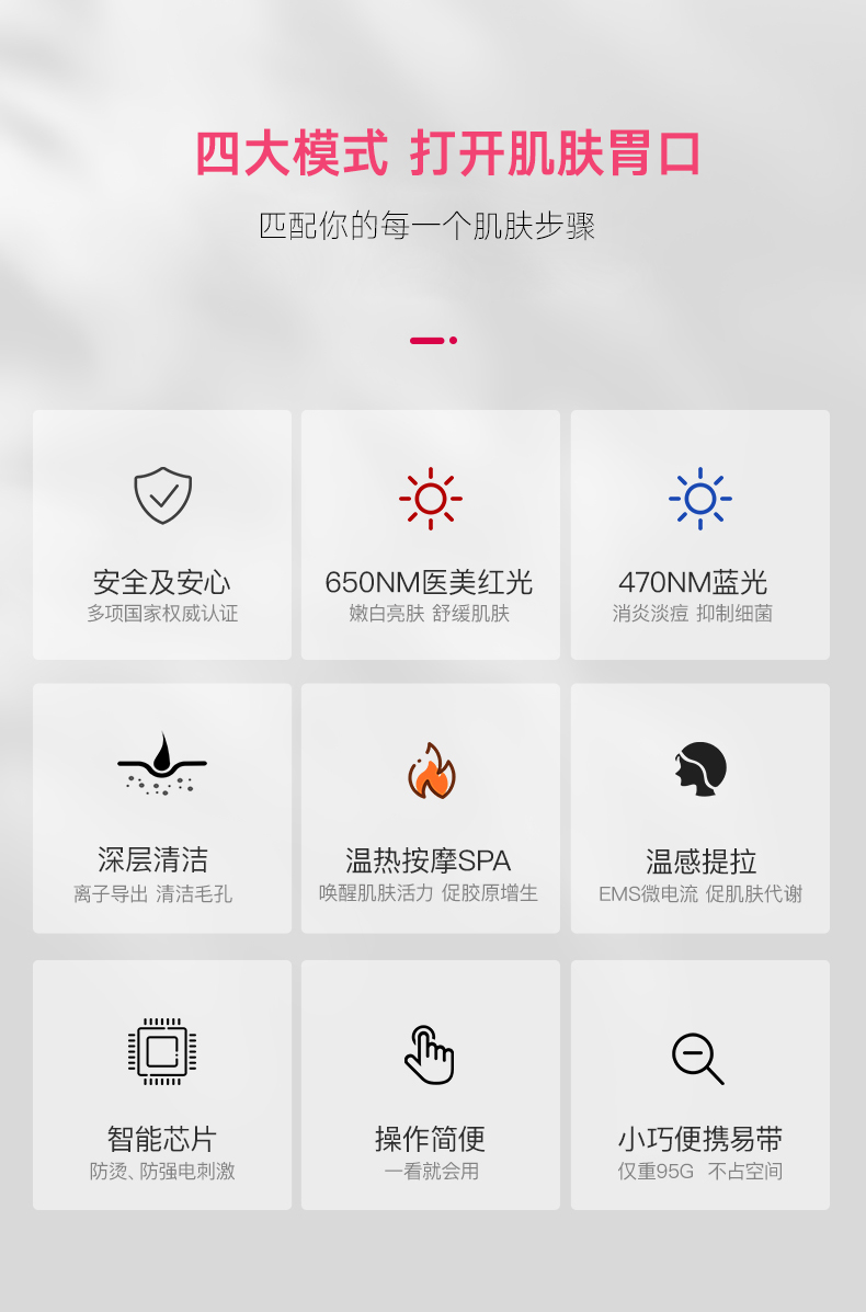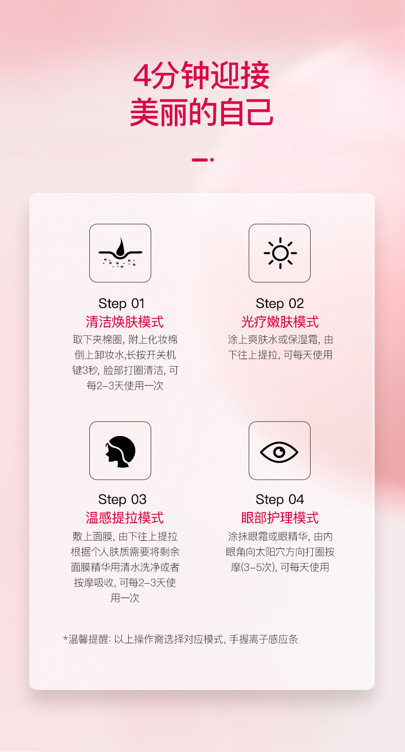 1、集清洁焕肤、光疗嫩肤、提拉紧致与眼部护理于一体,四大模式协同作用,满足日常护肤的多重需求。
