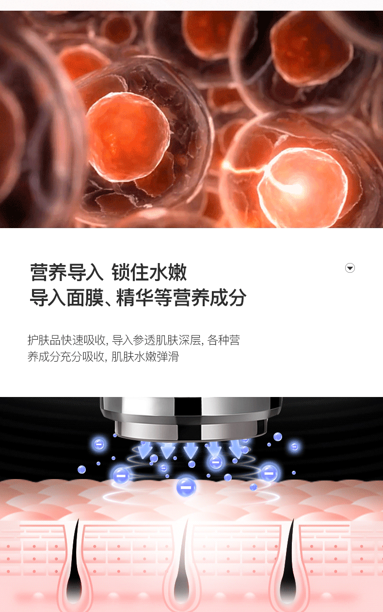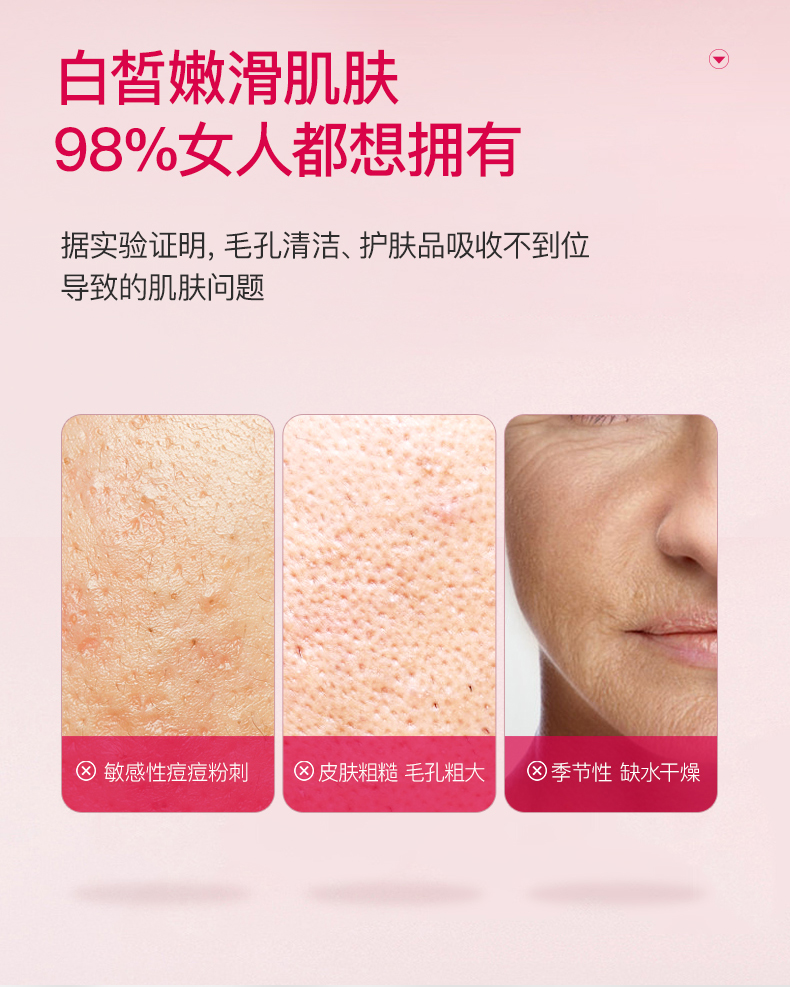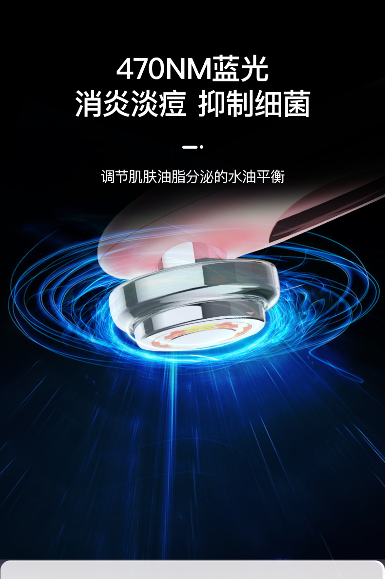 3、470nm蓝光光疗功能,帮助舒缓肌肤、淡化痘痘并抑制细菌滋生,让问题肌更快回归稳定状态。