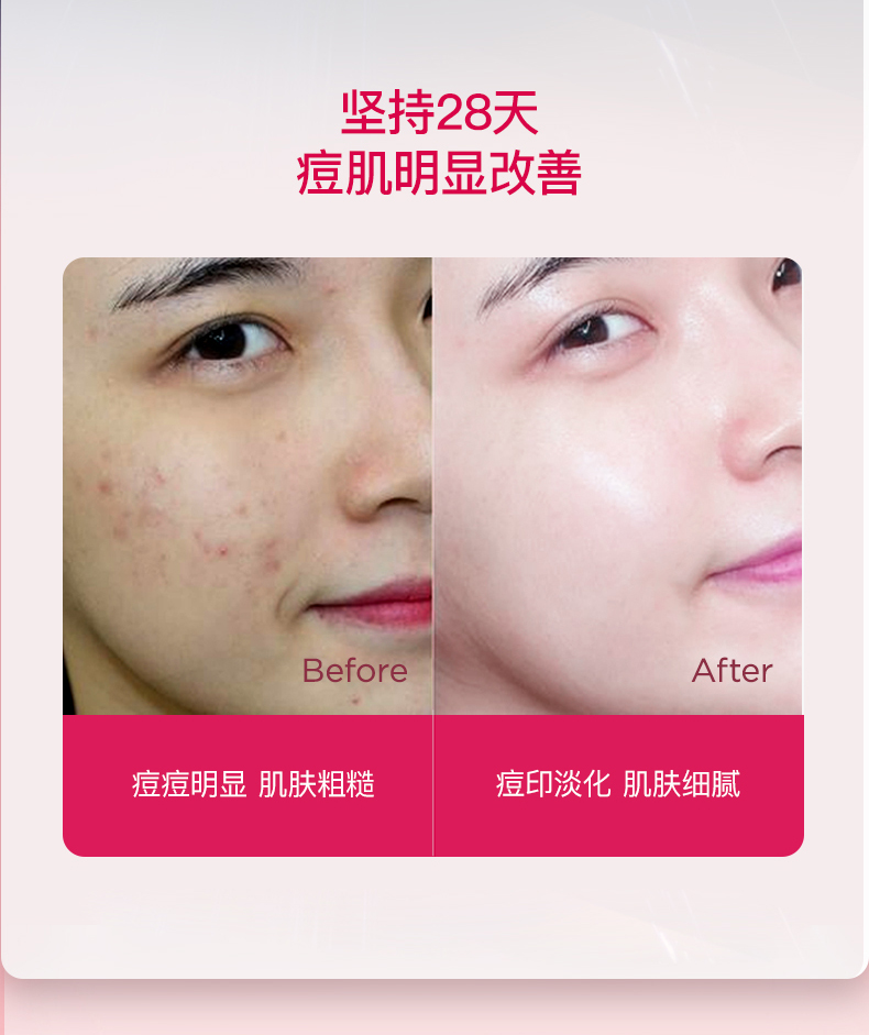 5、坚持使用28天,可明显改善痘肌状态,肤质更加细腻平滑,整体肤感更健康。