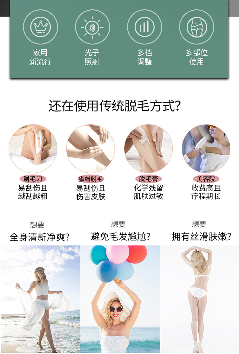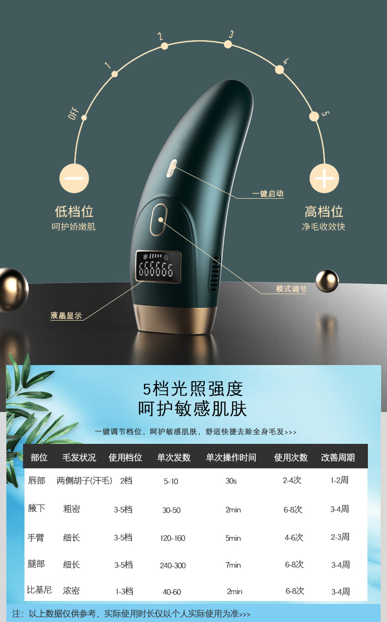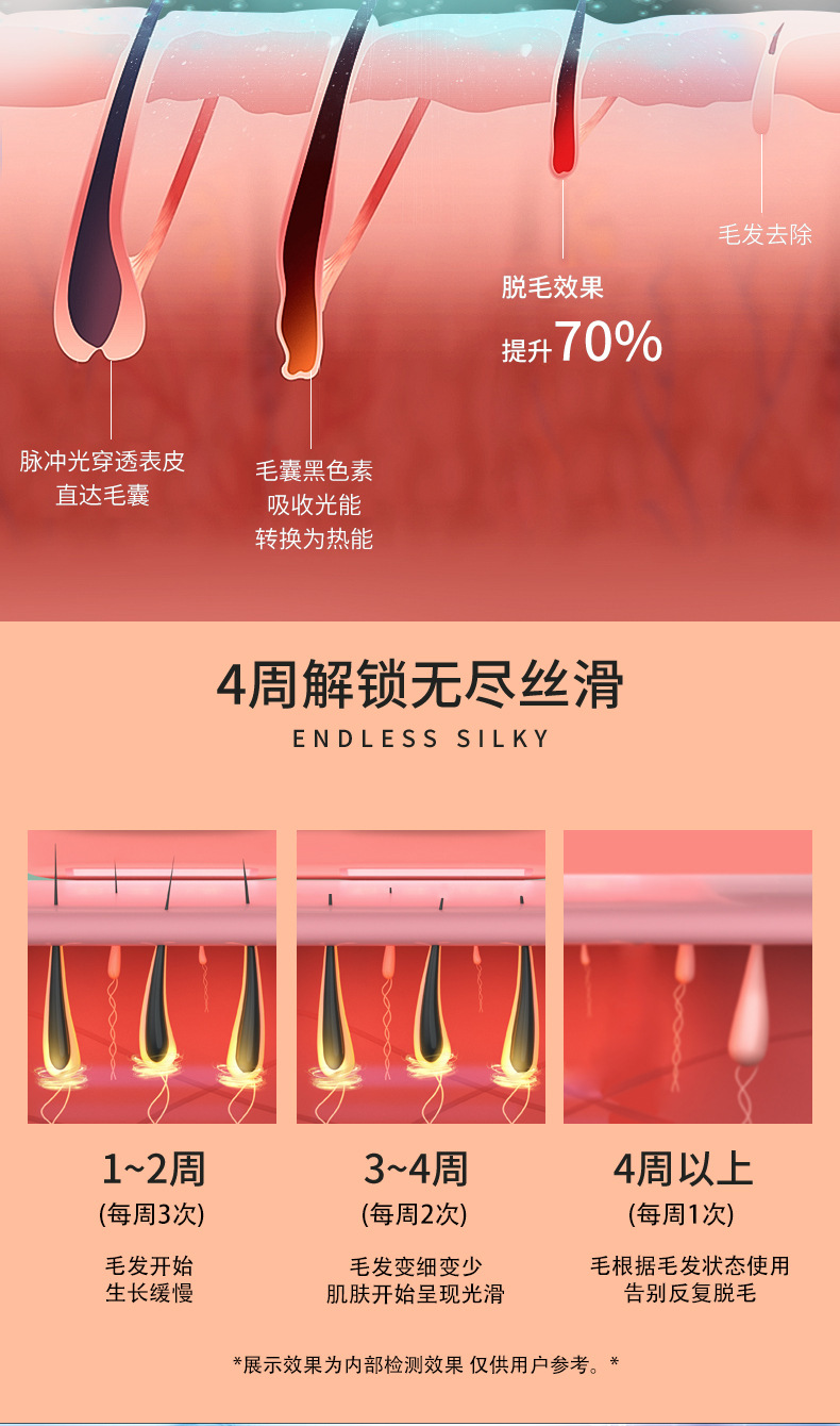 3、脱毛与嫩肤双重功能设计,在减少毛发生长的同时改善肤质状态。
