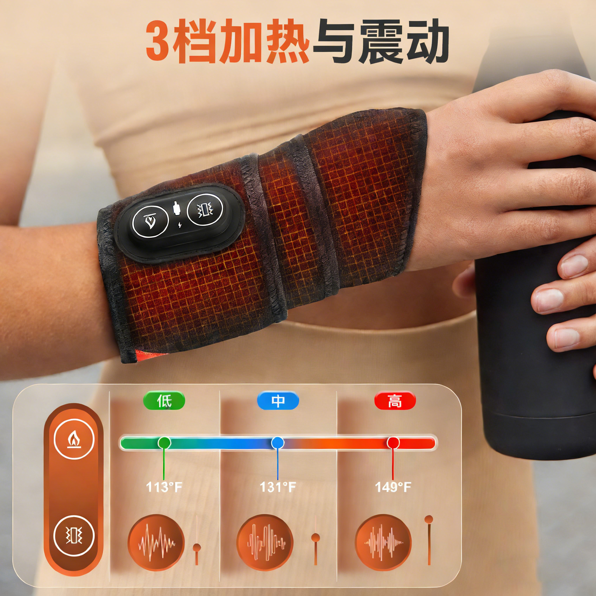 1、采用红光理疗结合加热与震动多重护理方式。 2、大面积深度加热设计,覆盖手腕核心区域,护理更全面更高效。 3、三档震动按摩模式可切换,模拟人工按压节奏。