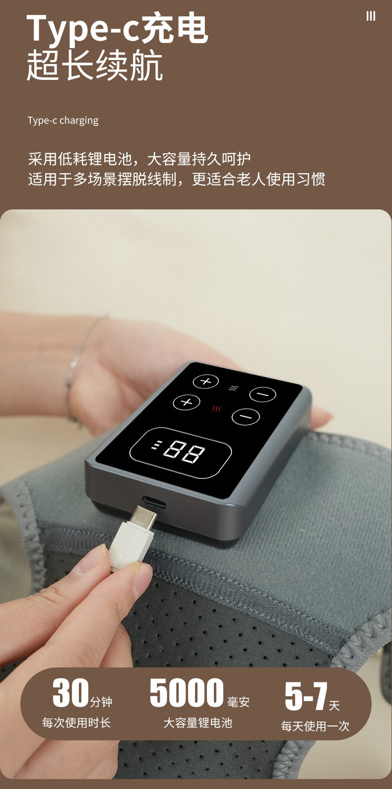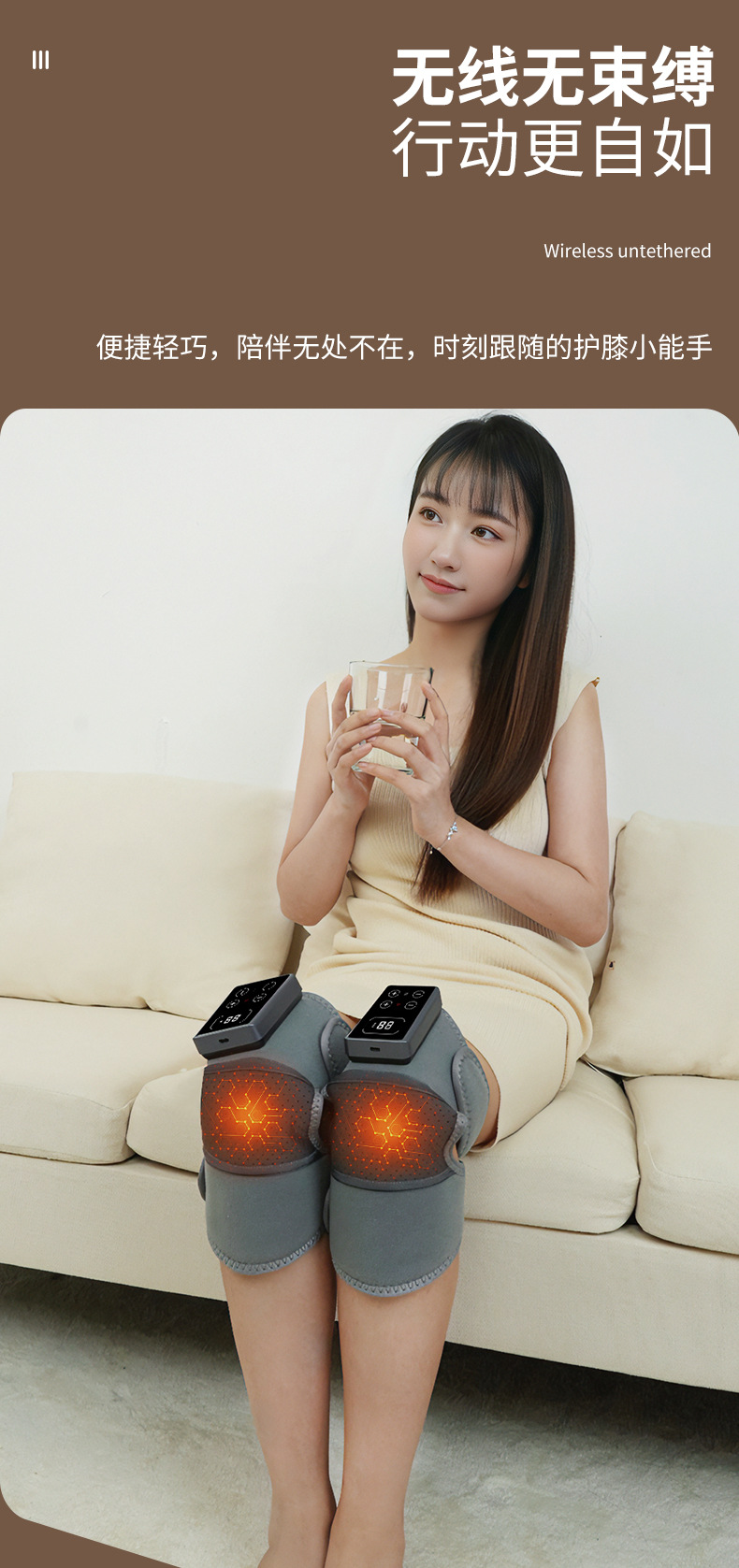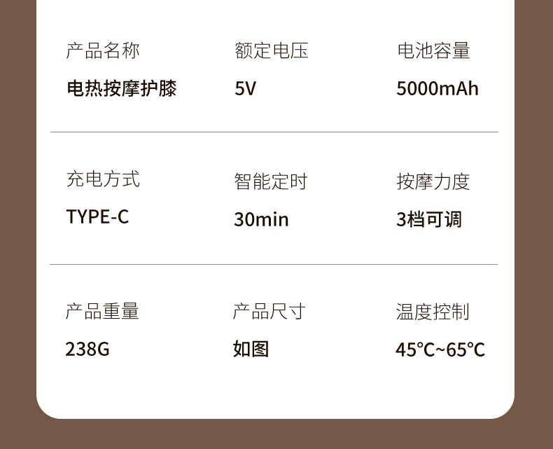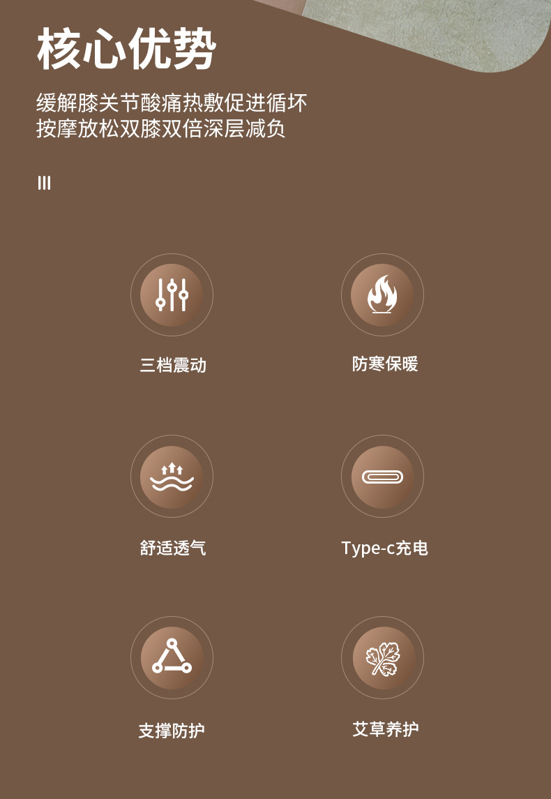 1、气压挤压搭配恒温热敷,同步放松肌肉与关节。 2、智能控温芯片精准调节温度,温热稳定。 3、内置大容量电池,一次充电可多次使用。