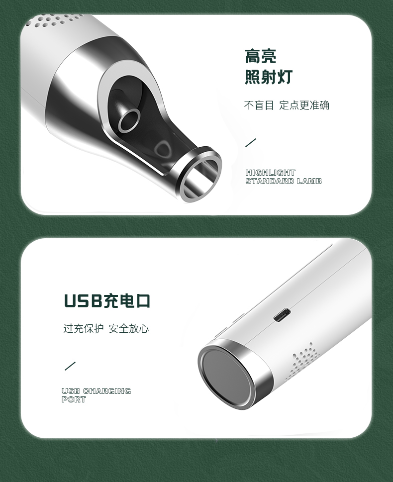 1、9档激光强度可调,满足不同使用需求。 2、高亮照射灯辅助定位,定点更精准不盲目。 3、USB 充电口搭配过充保护,充电更安全放心。