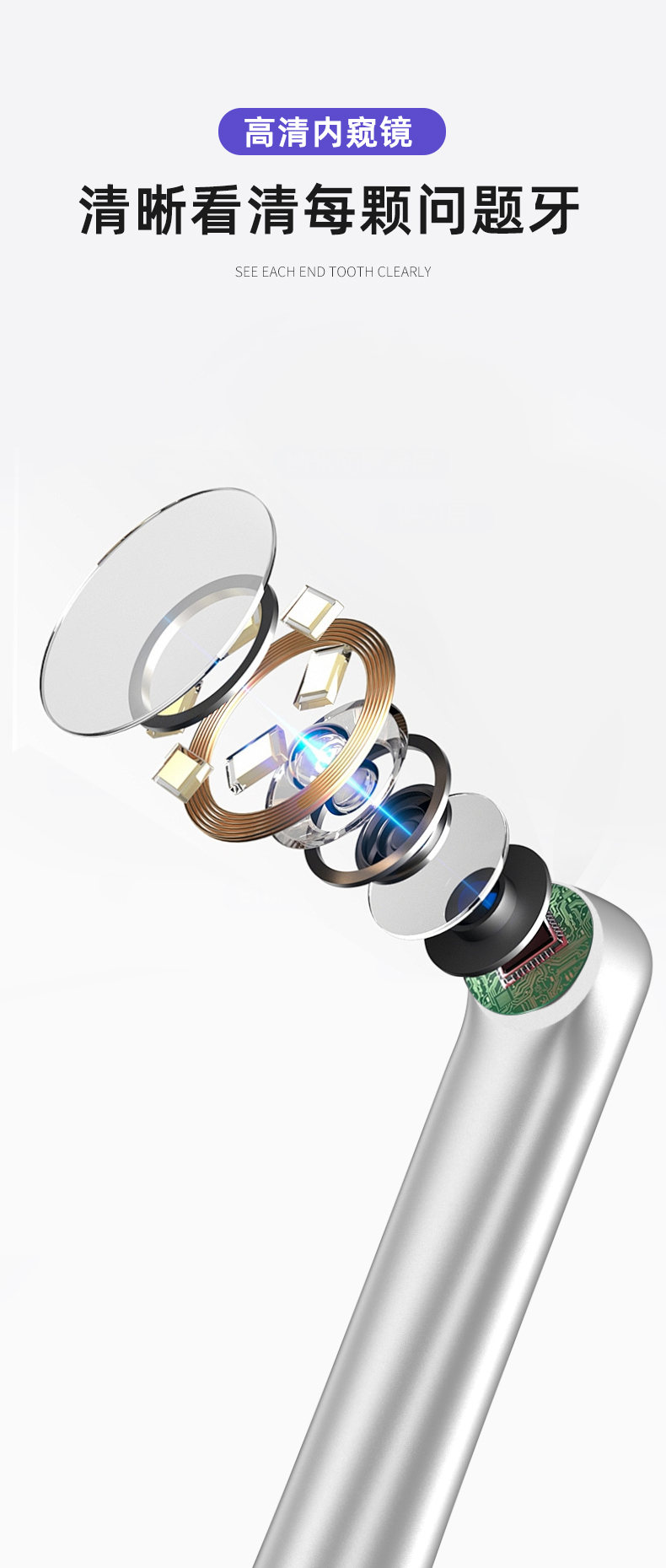 3、高清显微镜头设计,近距离放大口腔细节,帮助发现牙垢、牙结石及隐蔽部位的问题。