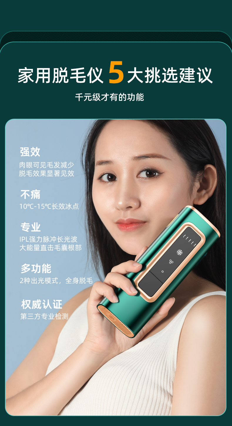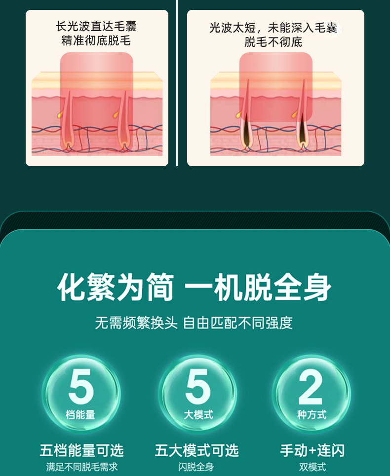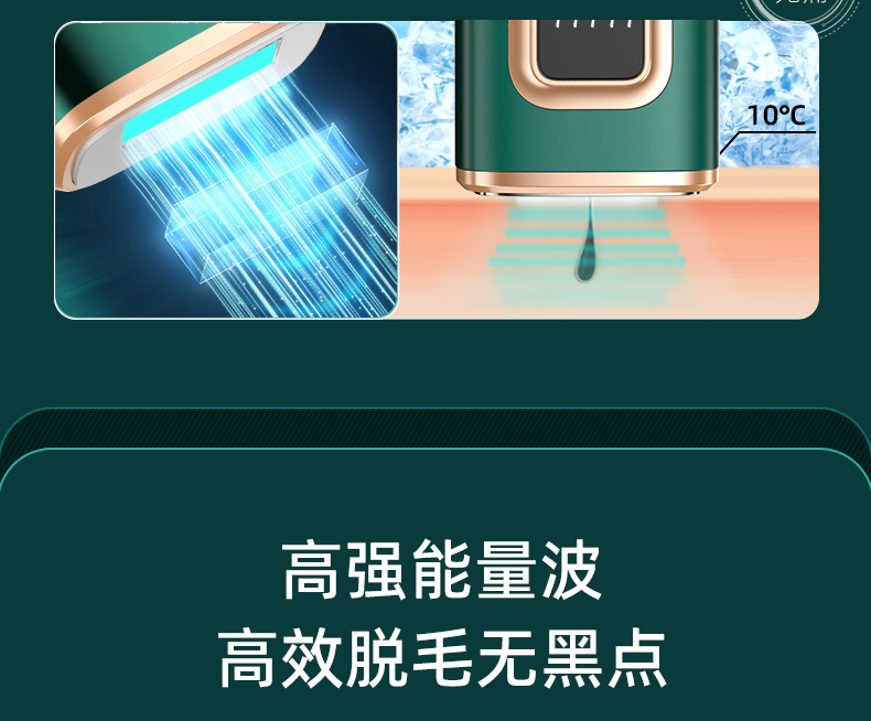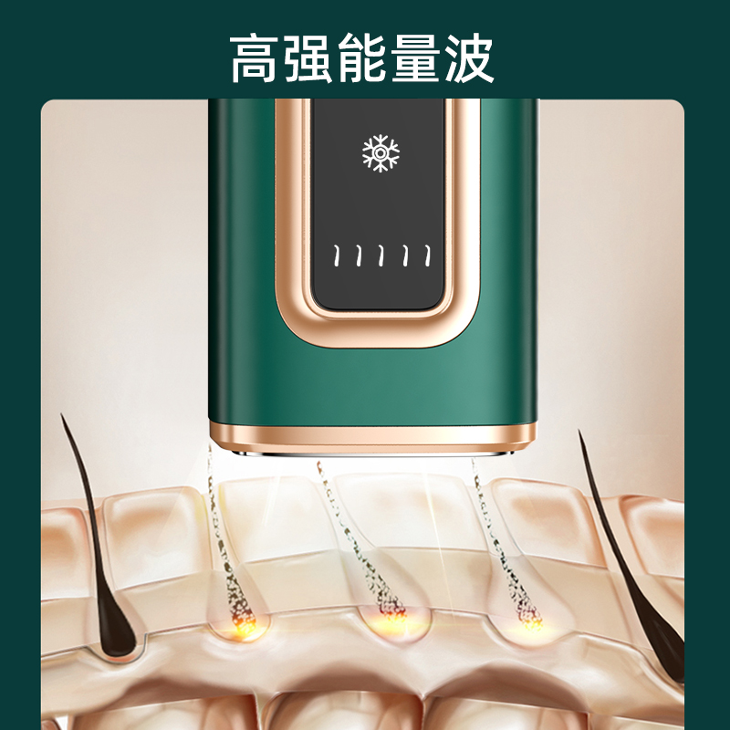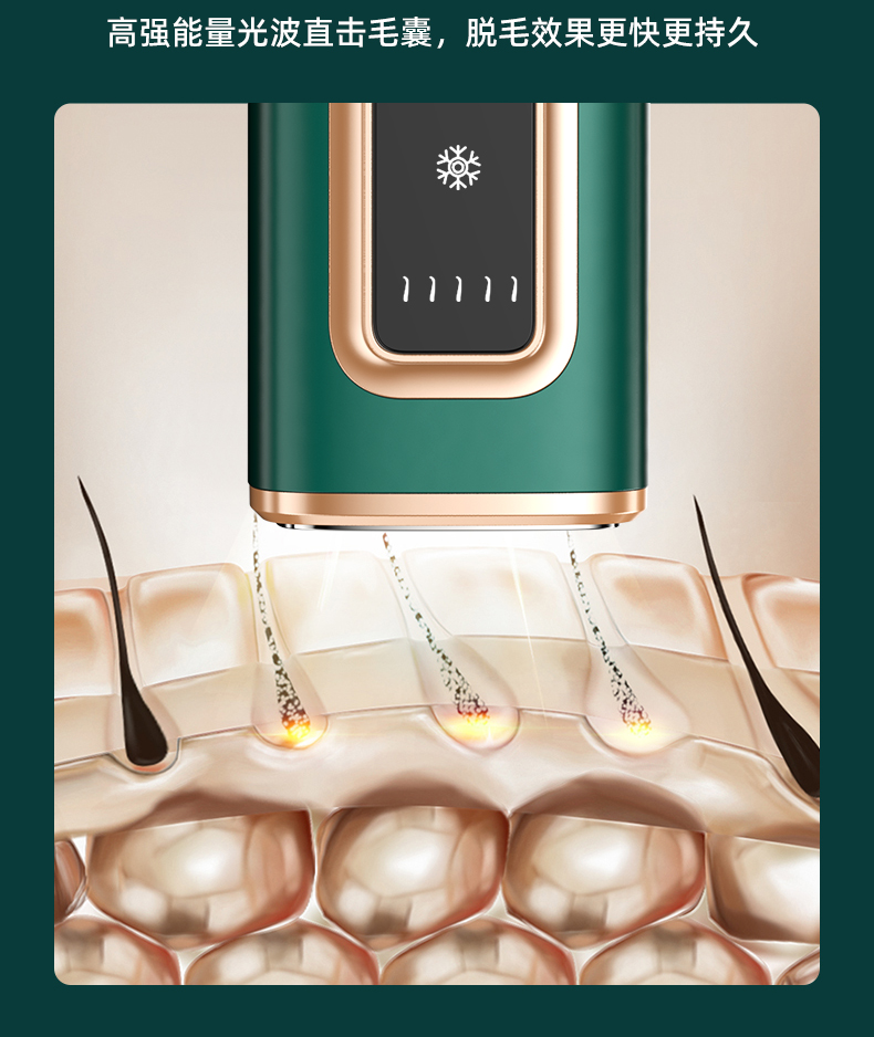 9、激光波长范围为 510–1200 nm,可作用于真皮层及皮下组织,对不同部位、不同深度毛发均具备作用效果。