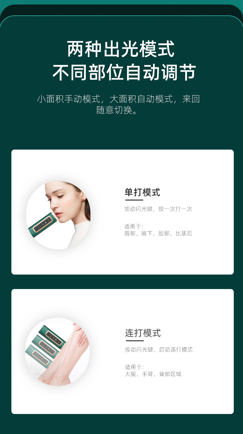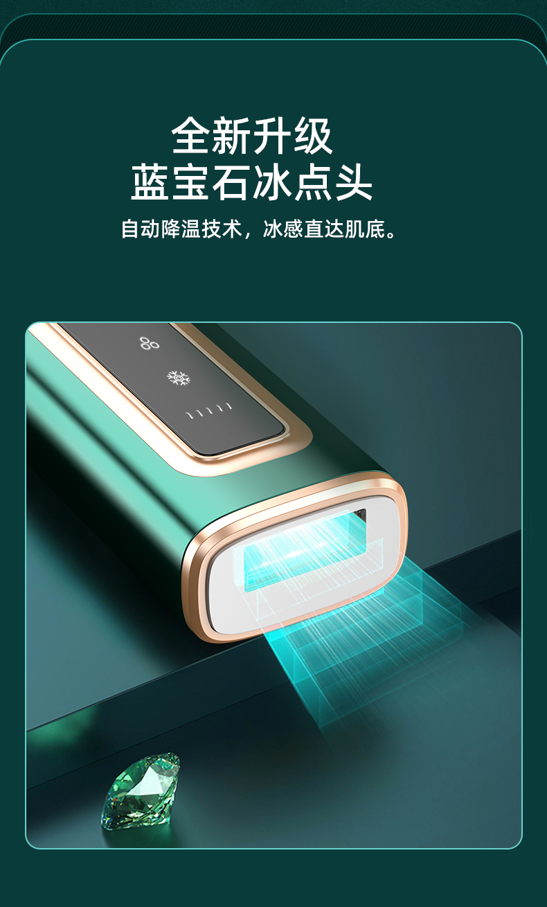 8、大光斑出光结构,单次覆盖面积更大,适合身体多部位及大面积脱毛使用。