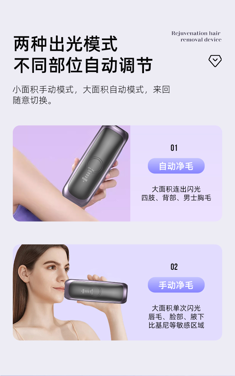 1、采用蓝宝石冰点脱毛技术,出光过程中持续为皮肤降温,使用体验更加舒适温和。