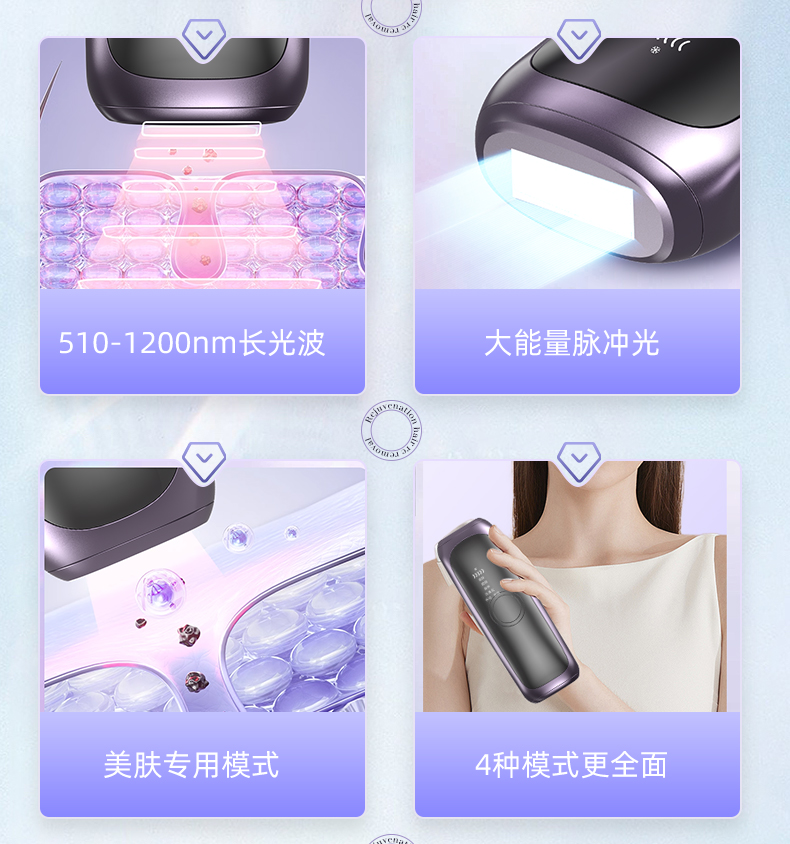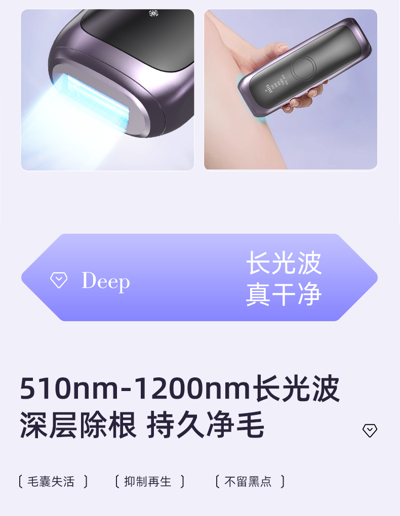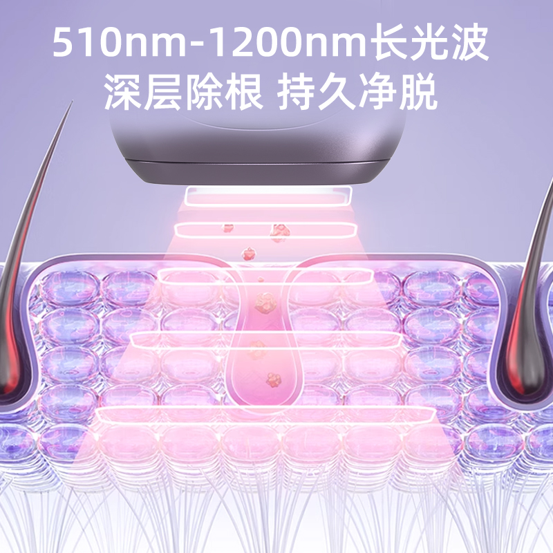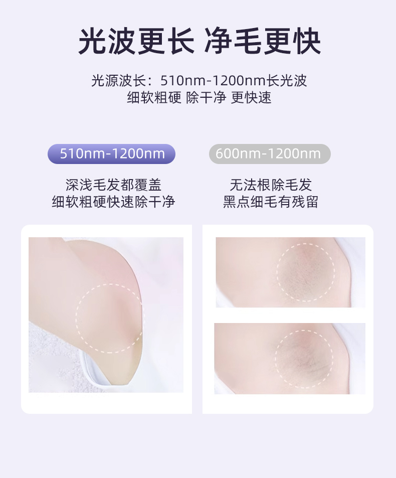4、510–1200nm 宽波段光源,适应不同毛发状态和多种脱毛部位。