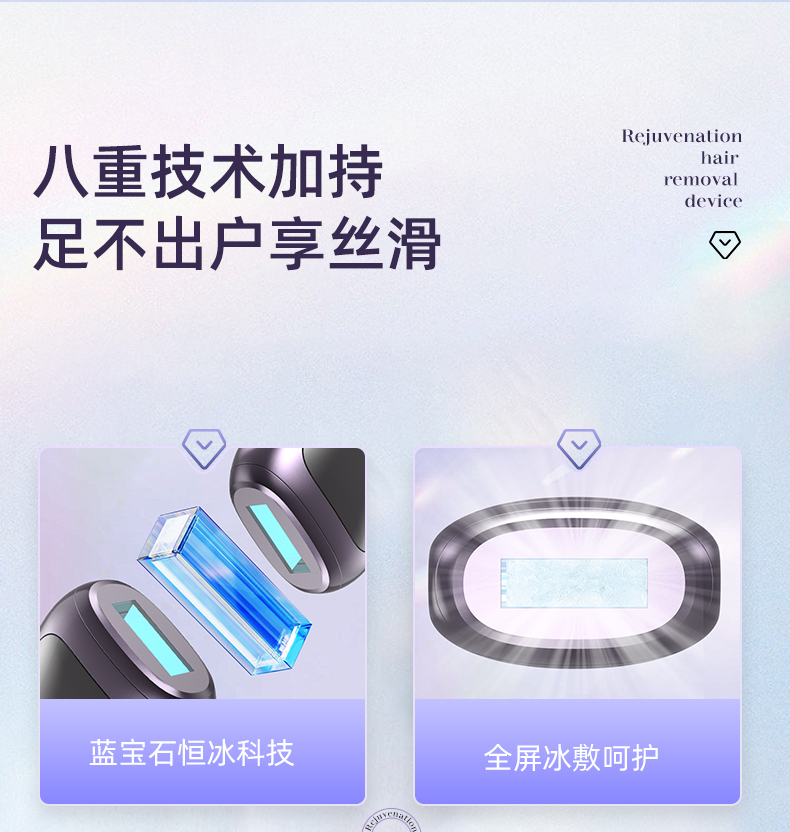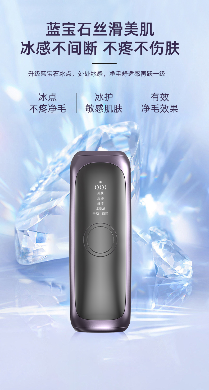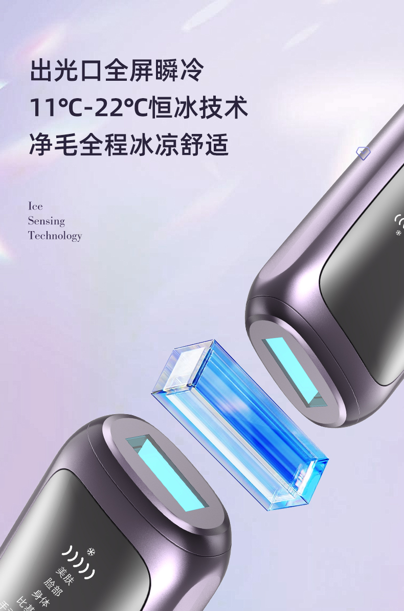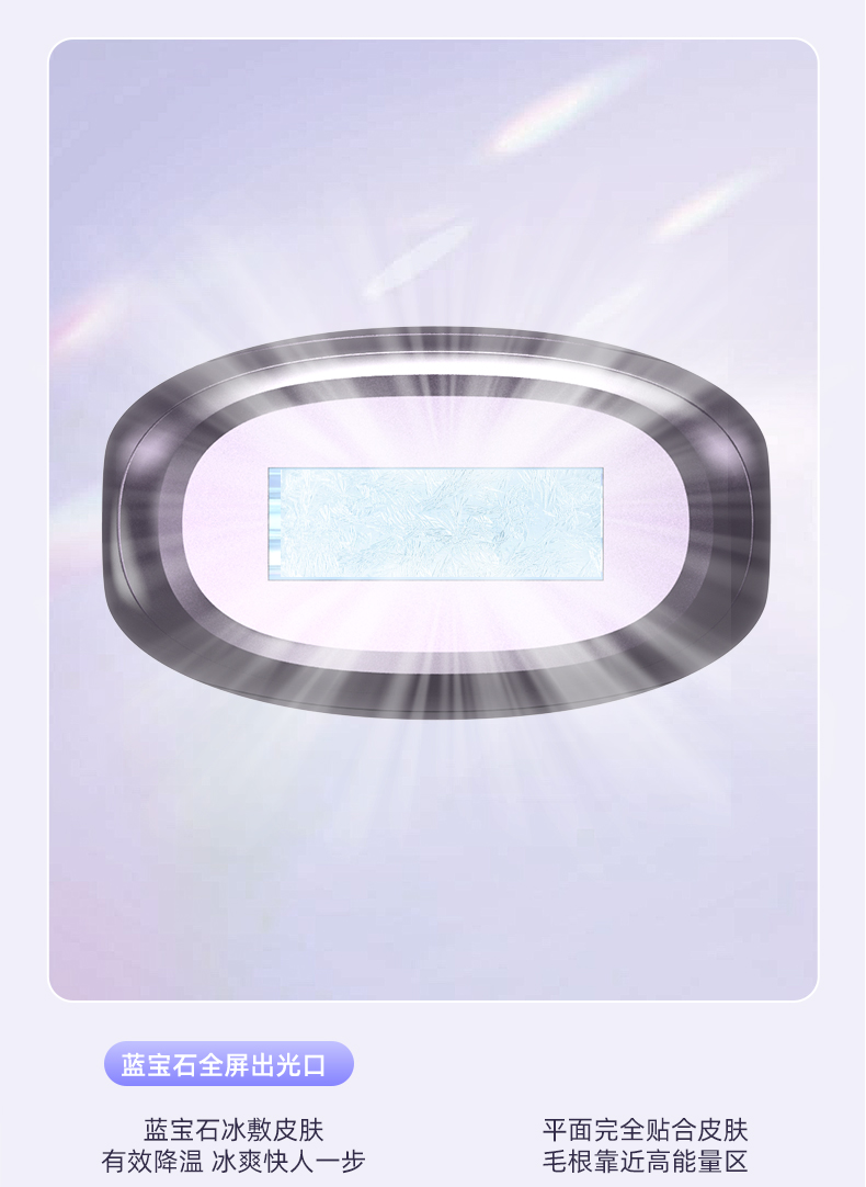 1、采用蓝宝石冰点脱毛技术,出光过程中持续为皮肤降温,使用体验更加舒适温和。
