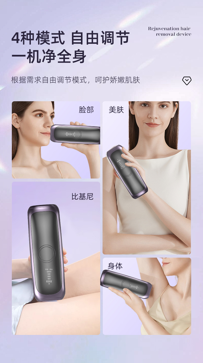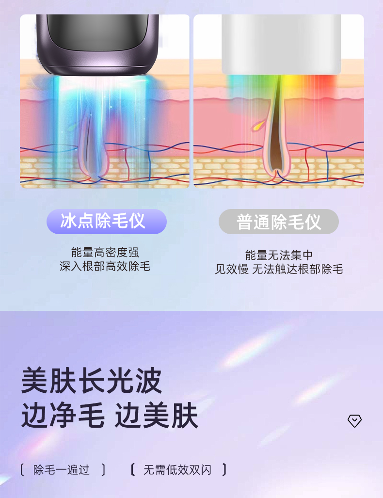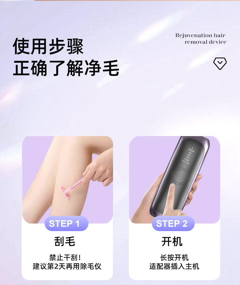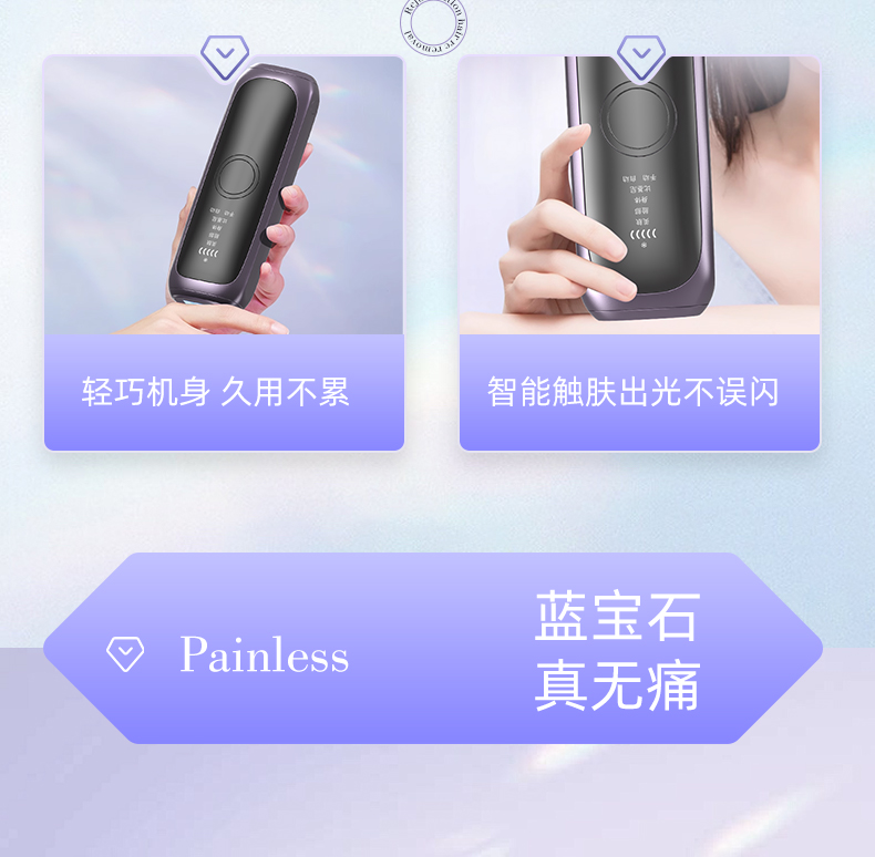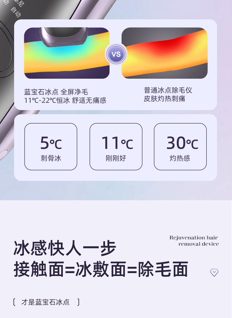 1、采用蓝宝石冰点脱毛技术,出光过程中持续为皮肤降温,使用体验更加舒适温和。