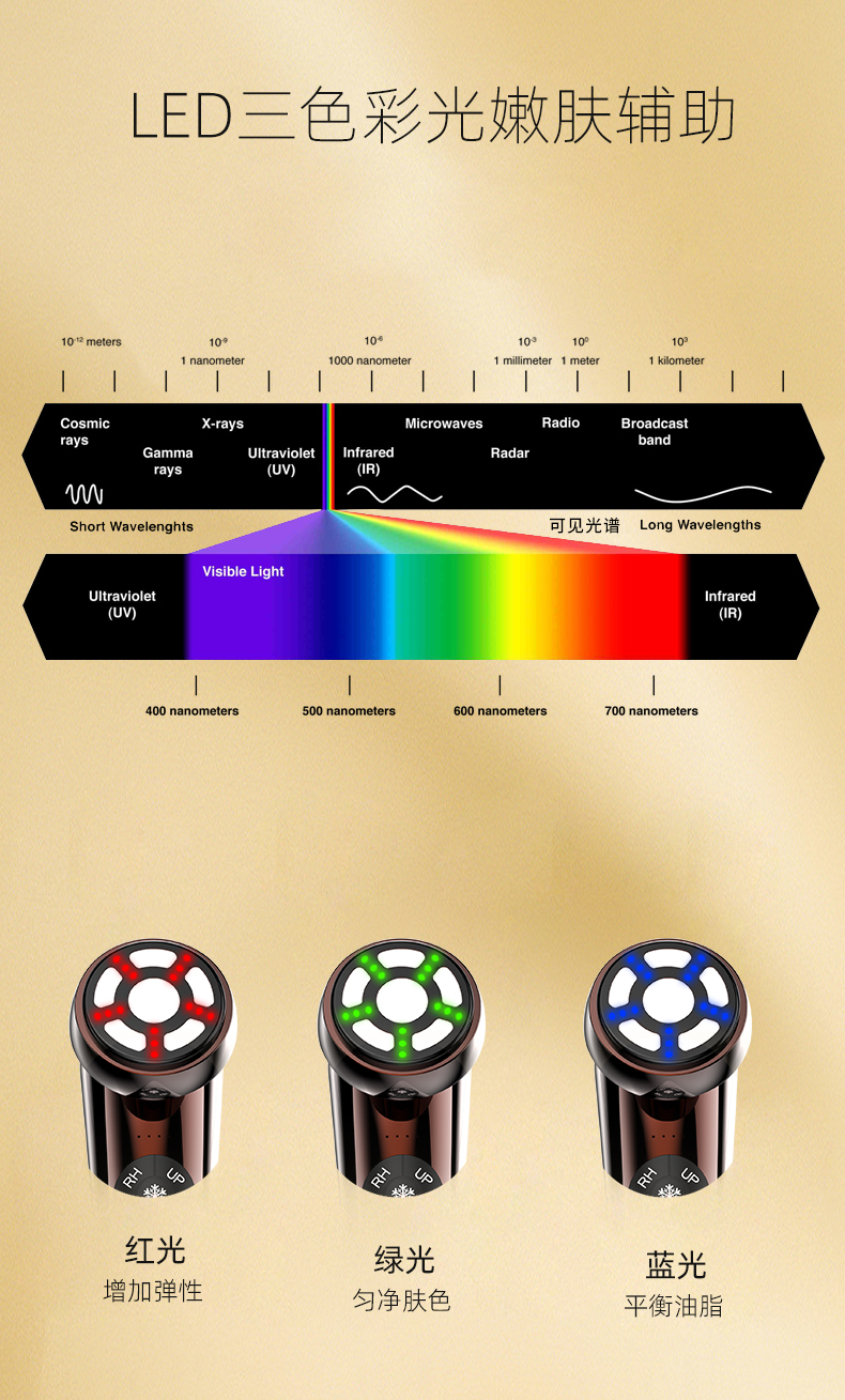 6、LED三色彩光嫩肤辅助系统,在导入过程中同步进行光疗护理,改善肌肤整体状态。