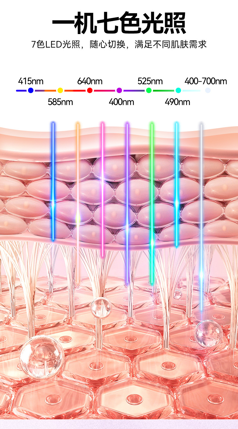 1、恒温加热功能,带来持续温热感,帮助放松肌肤,同时提升精华吸收效果。 2、采用七色彩光护理系统,多波段光效协同作用,帮助改善暗沉与细纹问题。 3、内置可充电电池设计,摆脱线材束缚,日常使用更加方便灵活。