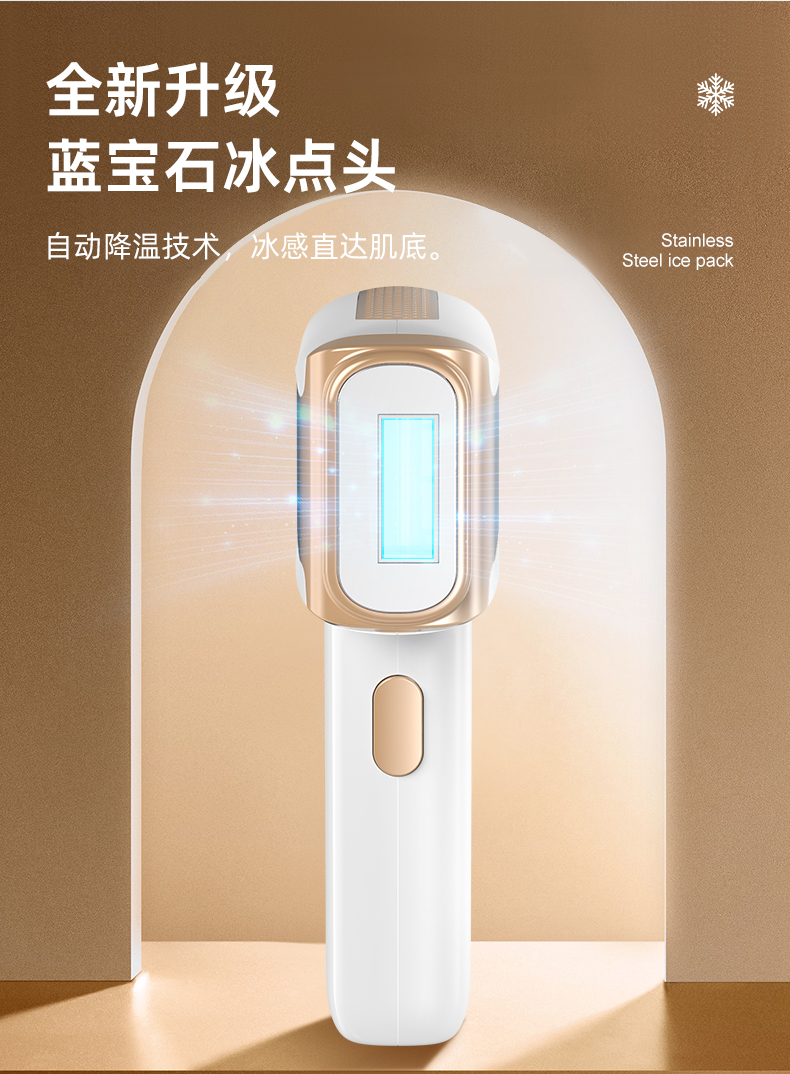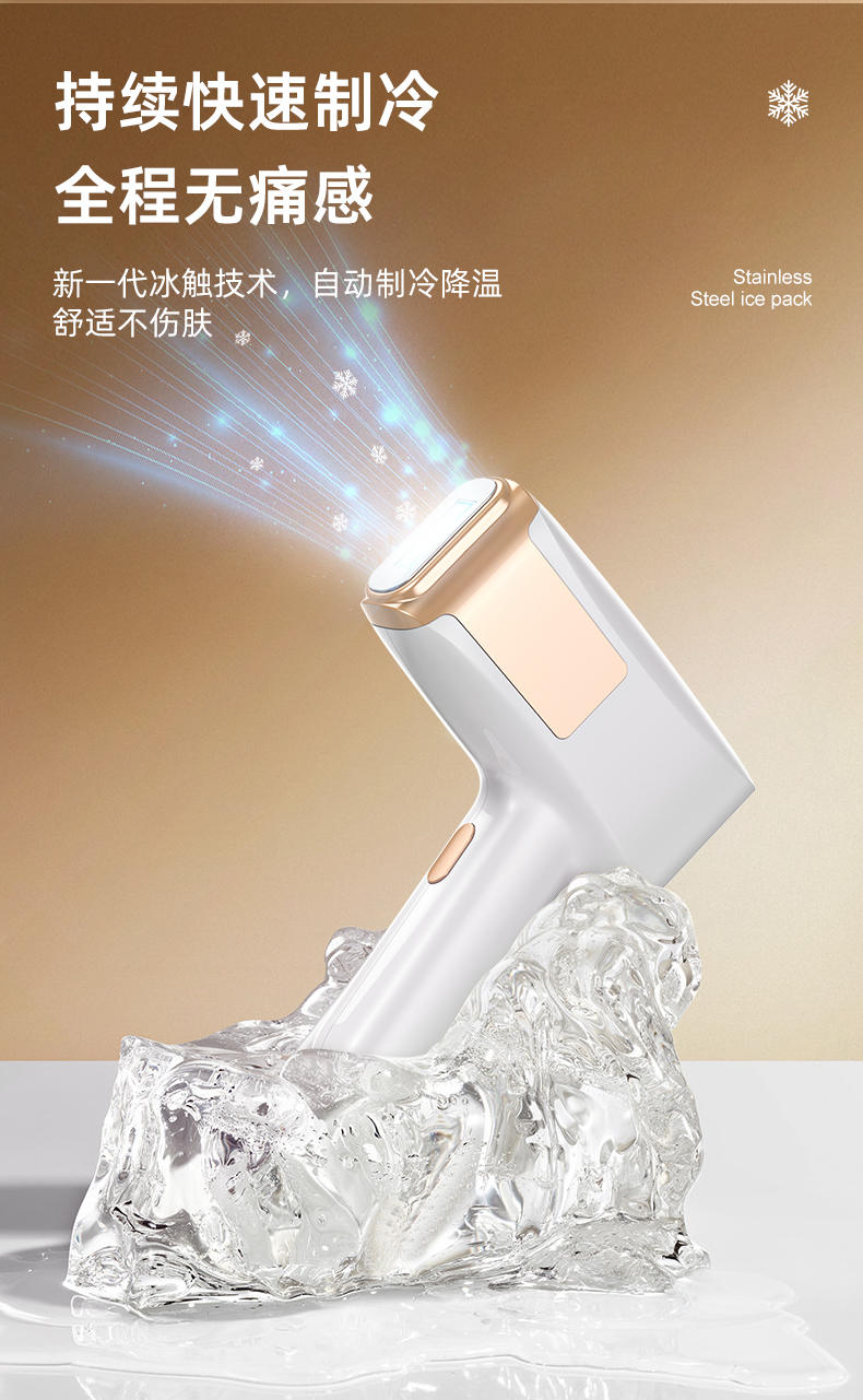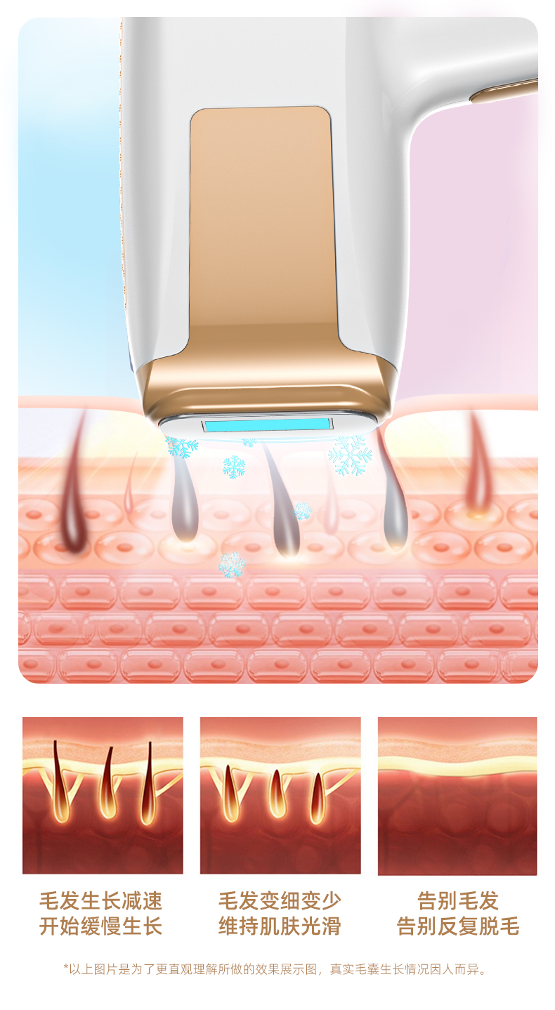 1、冰点脱毛设计,冰凉触感,使用时对皮肤刺激较小,脱毛过程更舒服。