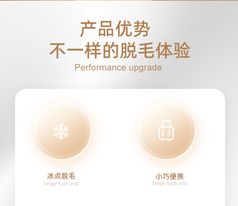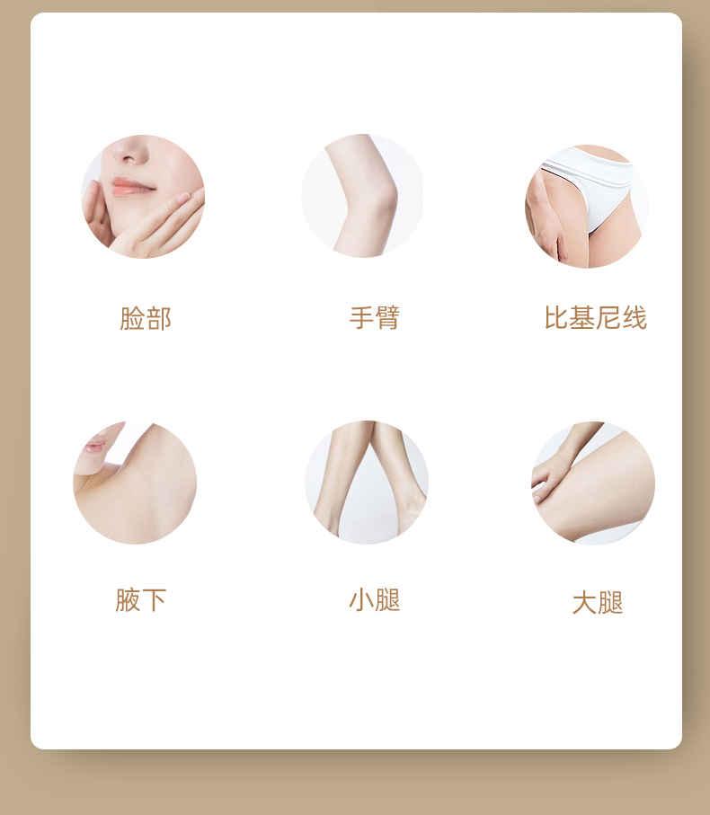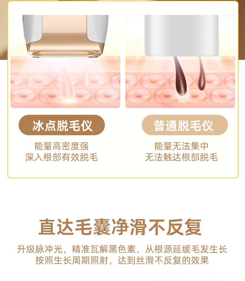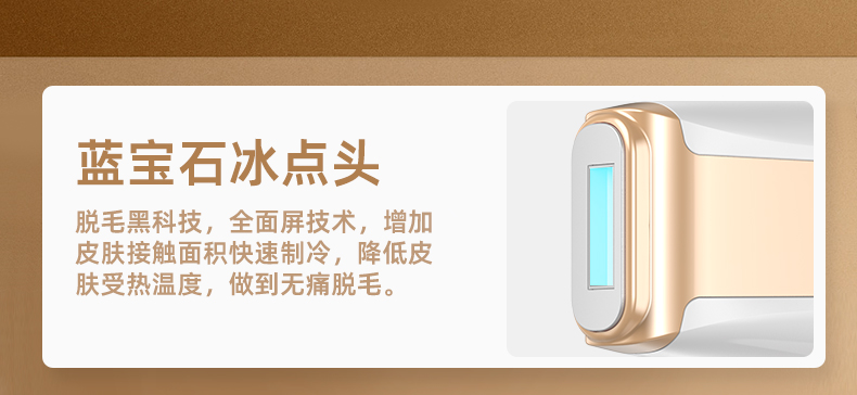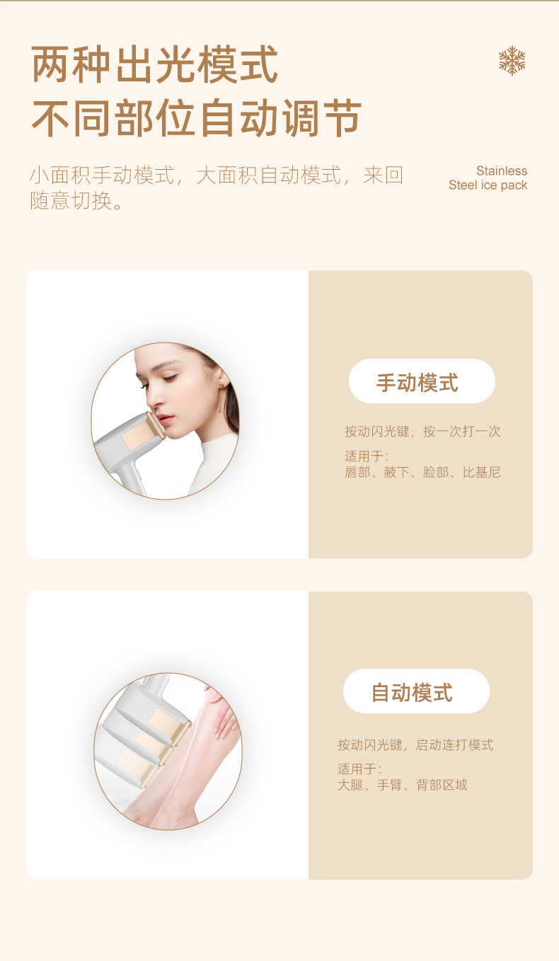 1、冰点脱毛设计,冰凉触感,使用时对皮肤刺激较小,脱毛过程更舒服。
