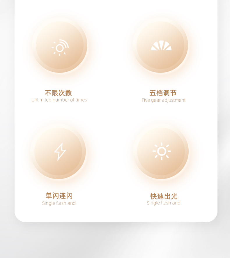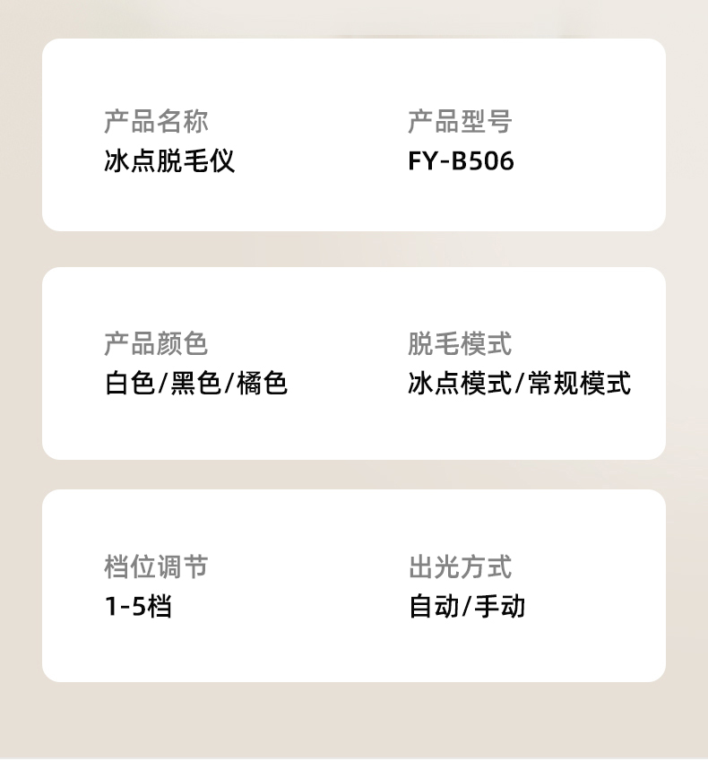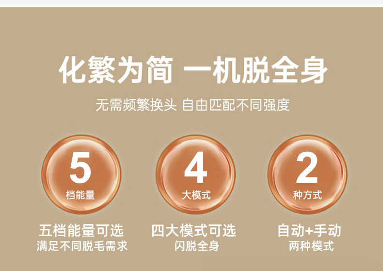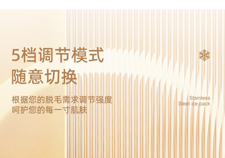 1、机身中部采用偏窄腰身,造型优美,更贴合手掌弧度,单手操作更省力,适合身体不同部位灵活操作。 2、支持 5 档功能调节,可根据不同肤色、毛发粗细及使用部位进行选择,新手也能轻松适应。、 3、在保持高速出光与深层作用效果的同时,搭配冰点冷却系统,脱毛过程更温和,兼顾效率与舒适度。