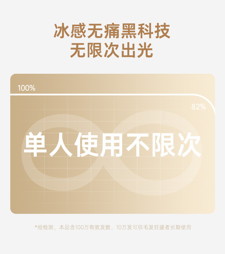 1、内置冷却装置,出光同时对皮肤进行降温,最低可达约 4℃,有效缓解热感,提升使用舒适度。 2、升级为无限闪光次数配置,满足长期、高频使用需求,无需更换灯头。 3、冷却与出光同步进行,有效降低使用过程中的灼热感与不适感,提升整体使用舒适度。