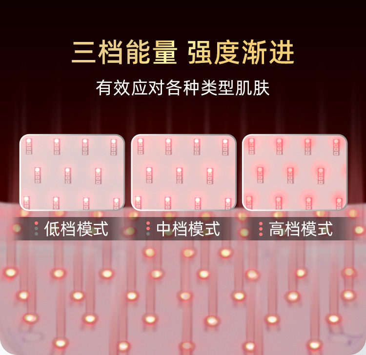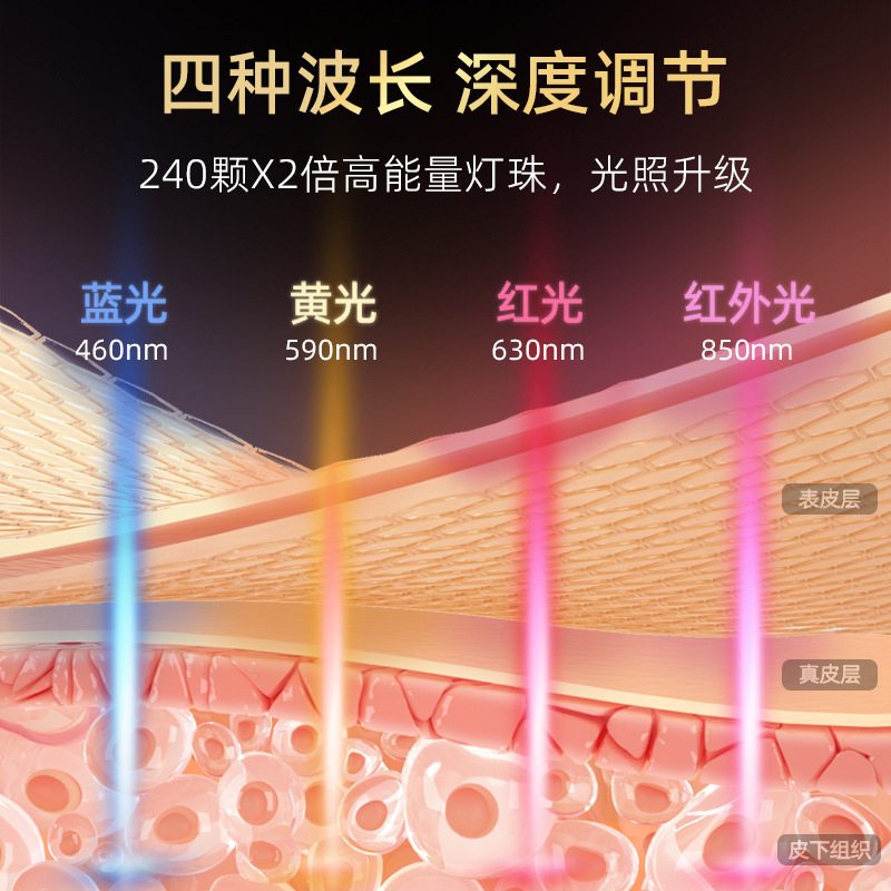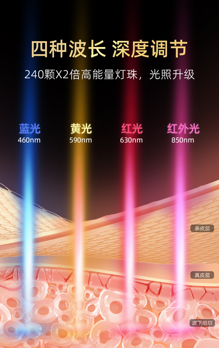 4、支持蓝光、红光、黄光与红外光多重光源组合,不同波段协同作用,满足多样化护肤需求。