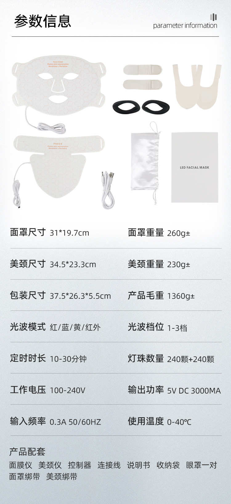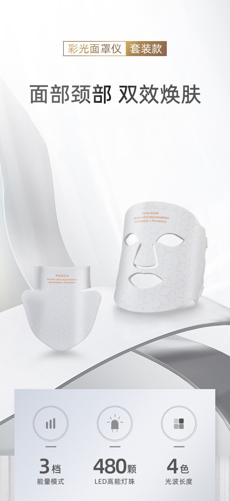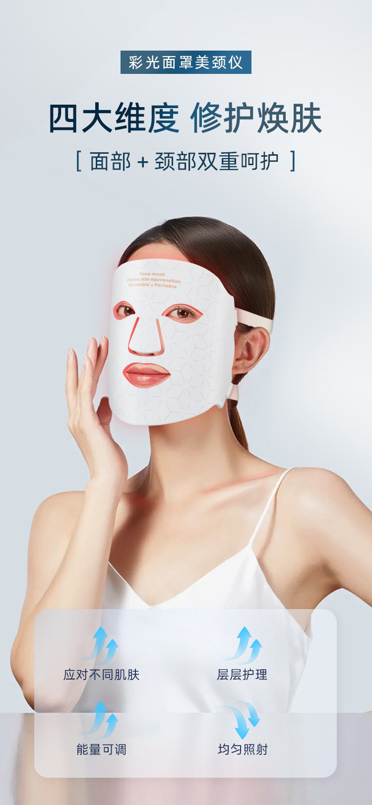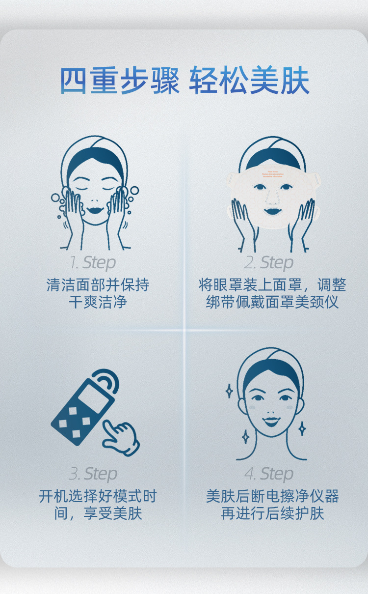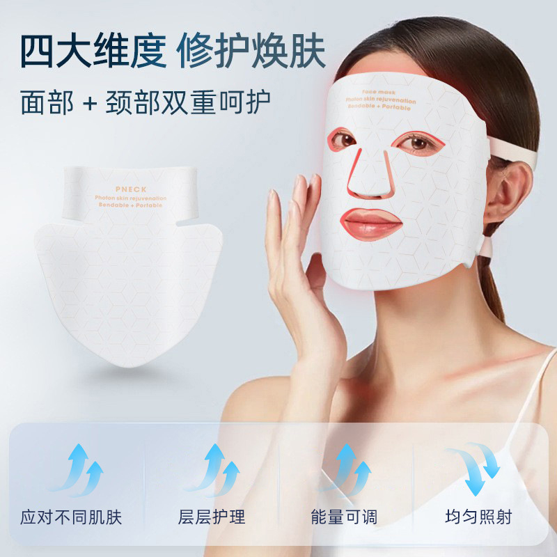 1、面部与颈部双效护肤设计,同时呵护脸部与颈部肌肤,实现更全面、更均衡的光疗护理。