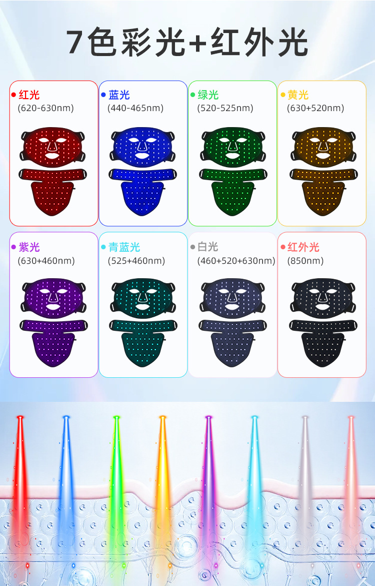 3、七彩光源搭配红外光技术,多波段协同作用,满足提亮、修护、舒缓与紧致等多重护肤需求。