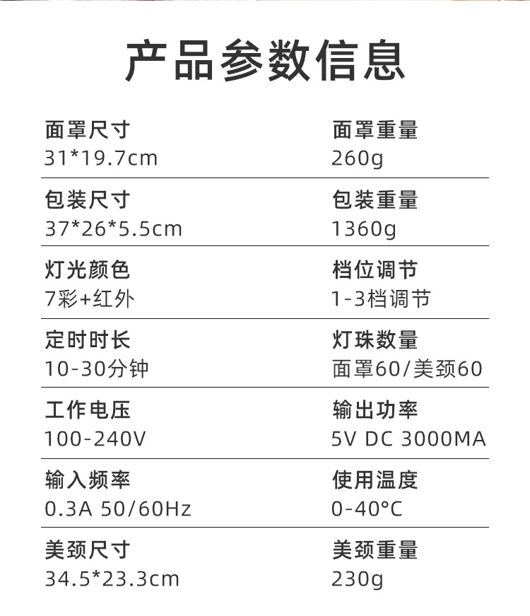 1、面颈套装双重设计,同时呵护面部与颈部肌肤,实现更全面、更均衡的光疗护理。