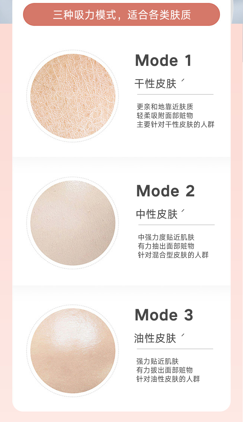2、内置三档吸力模式,可根据不同肤质自由调节,满足敏感肌与油性肌的差异化清洁需求。