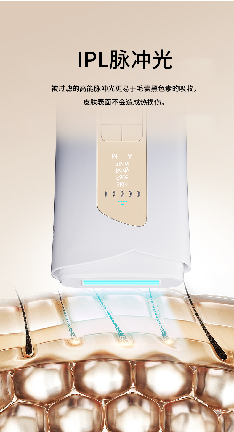 1、采用IPL强脉冲光脱毛技术,通过定向光能作用于毛囊根部,帮助抑制毛发生长,实现稳定持久的脱毛效果。
