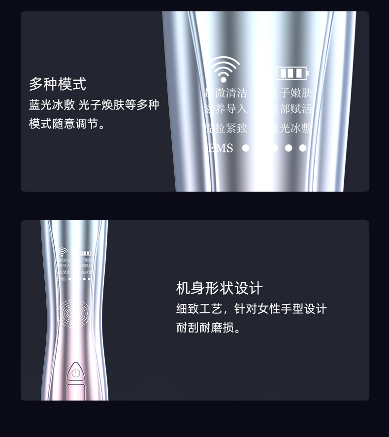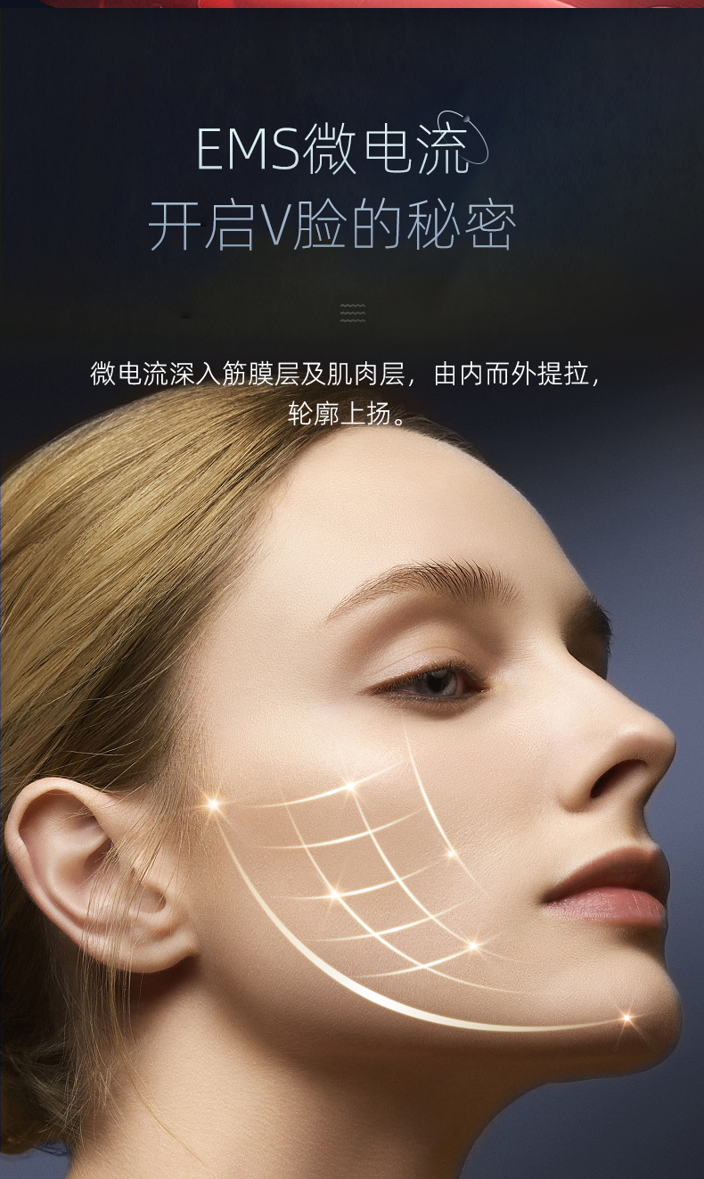 2、搭载EMS微电流模式,通过温和电脉冲刺激肌肤表层,有助于提升轮廓紧致度,塑造自然V脸线条。
