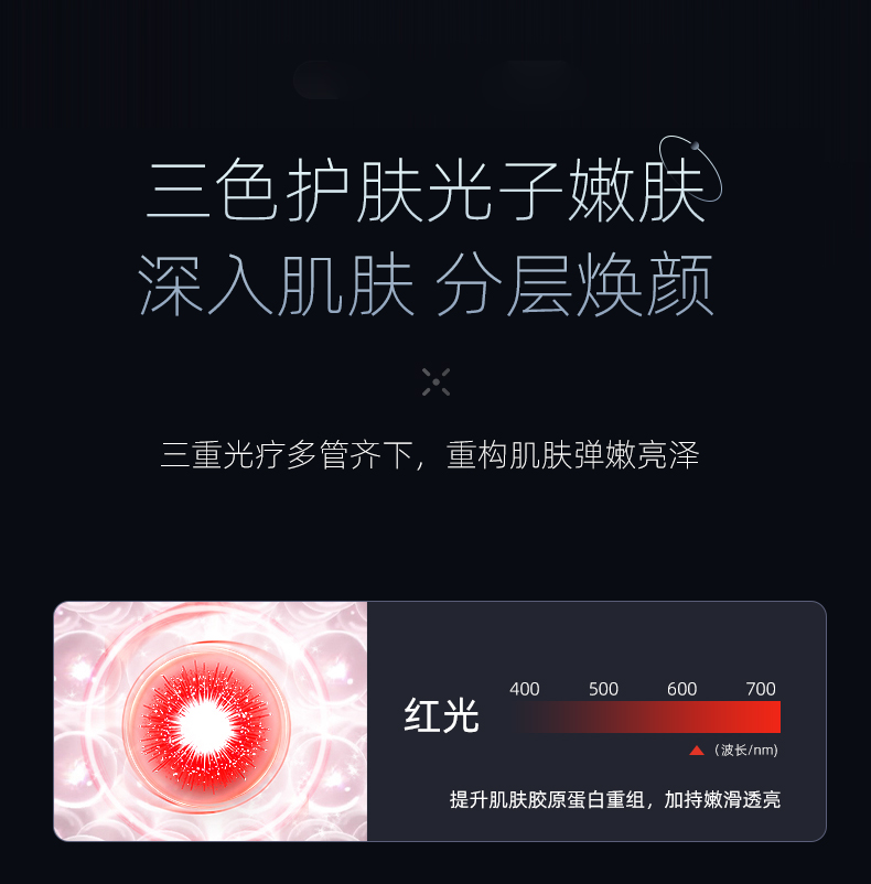 4、三色光子嫩肤系统设计,红光、橙光与蓝光可根据不同肤况进行针对性护理。