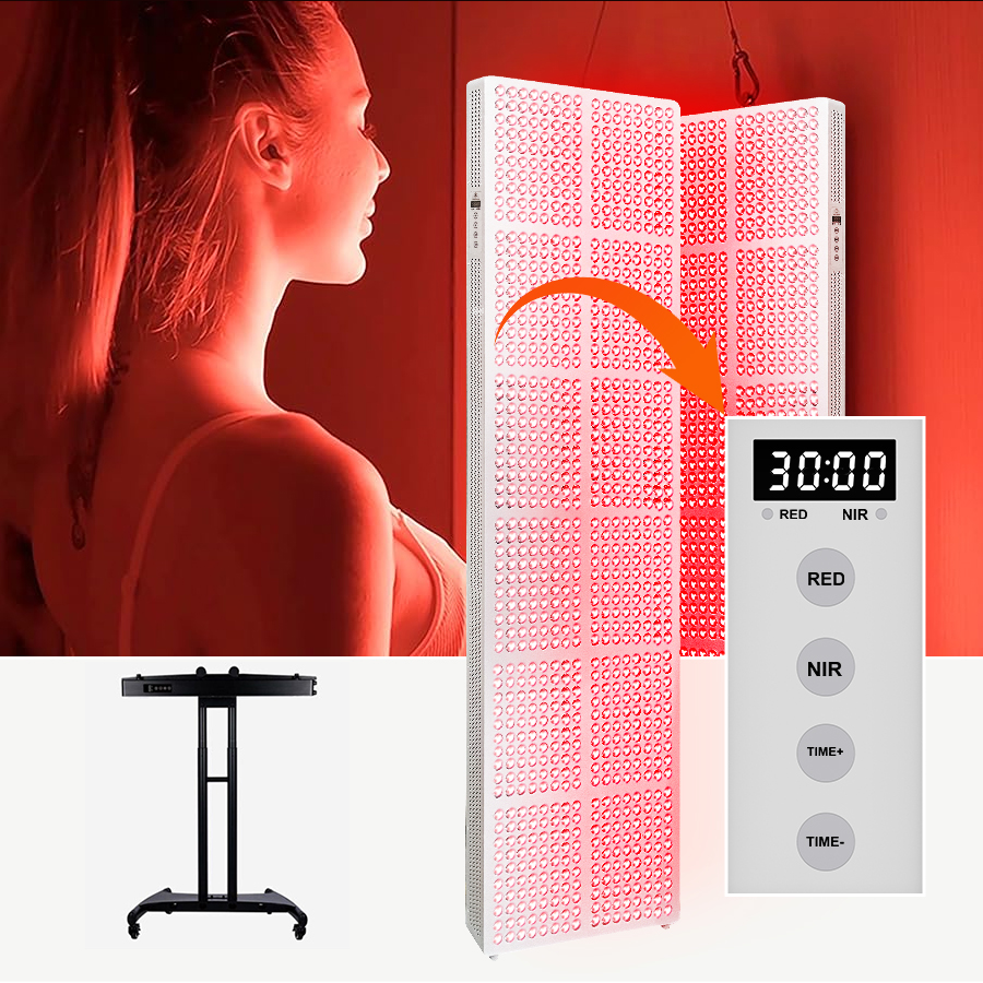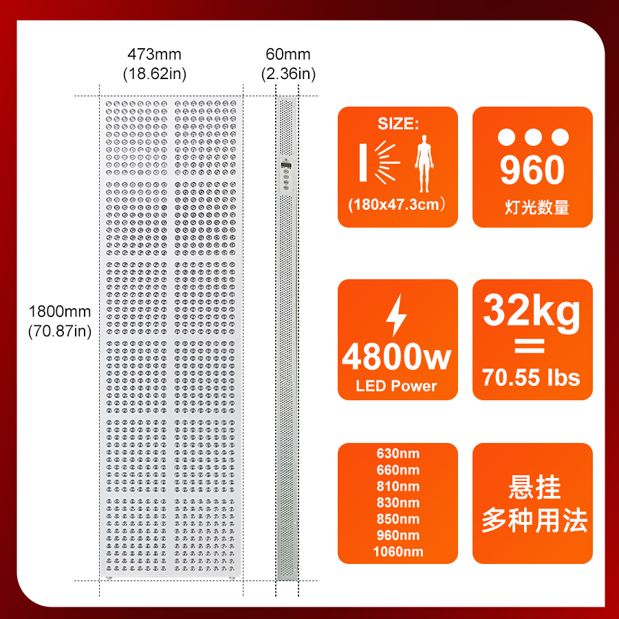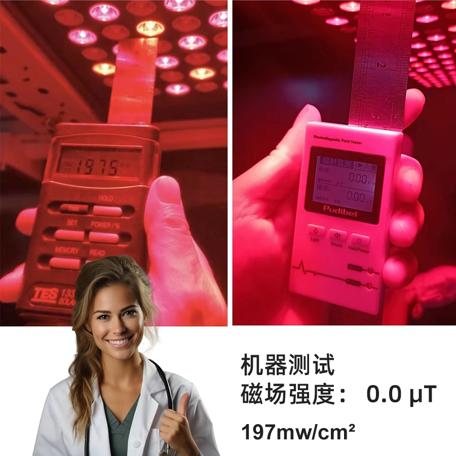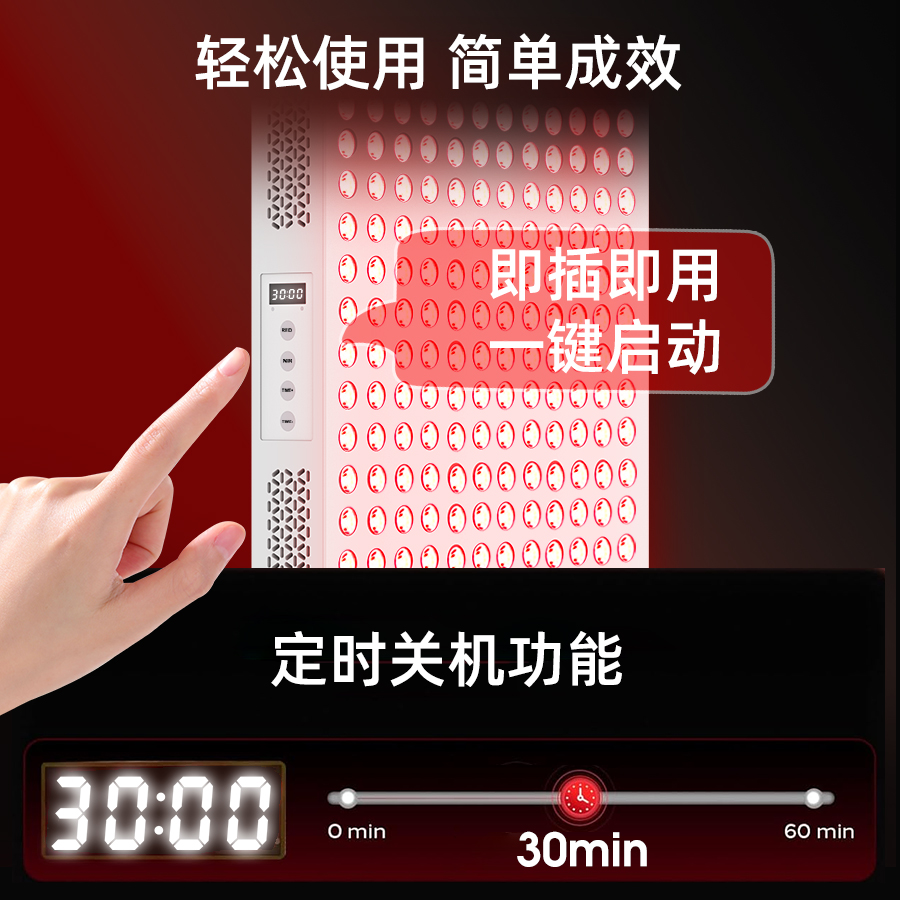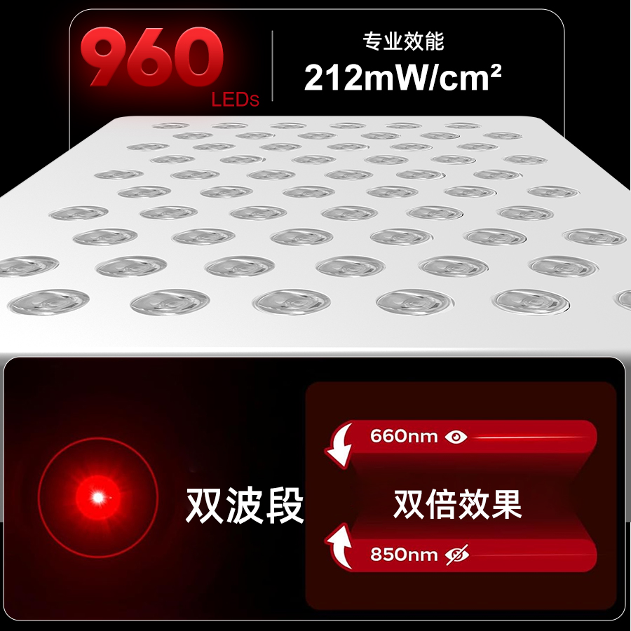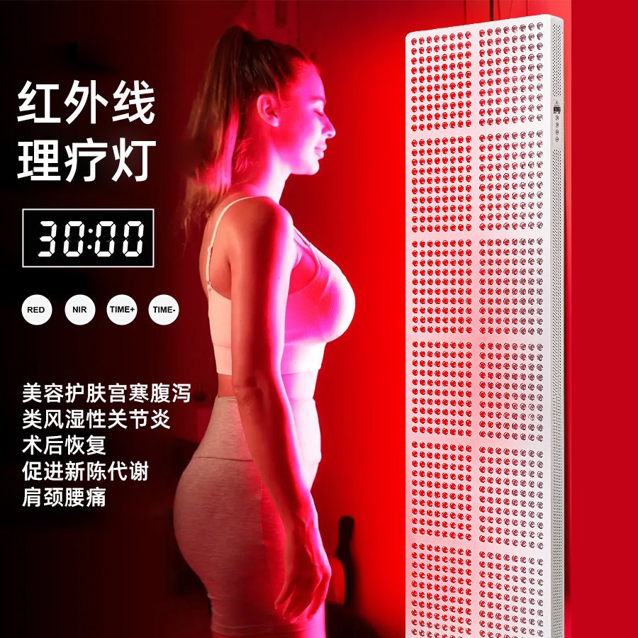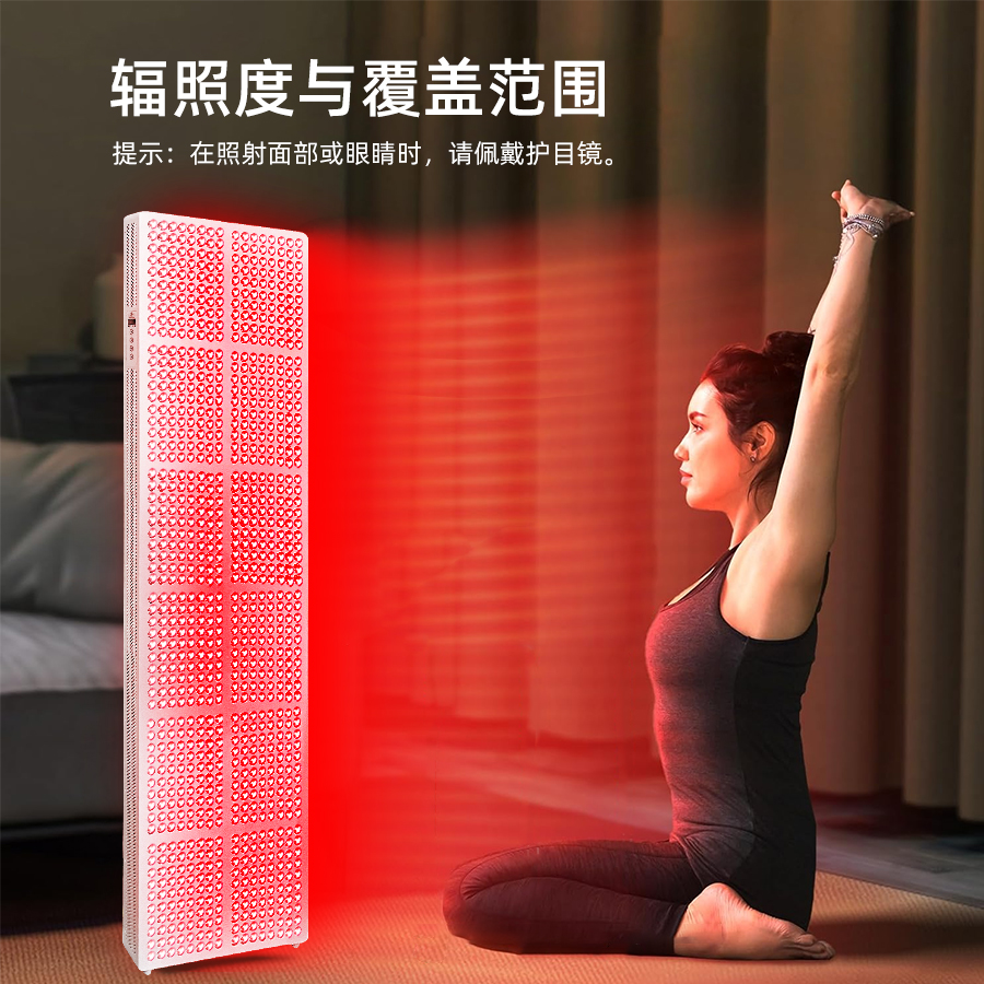 1、采用红光与近红外双波段光源组合设计。 2、大面积高功率光照输出,适用于全身范围使用。 3、插电即用设计,操作简单直观。